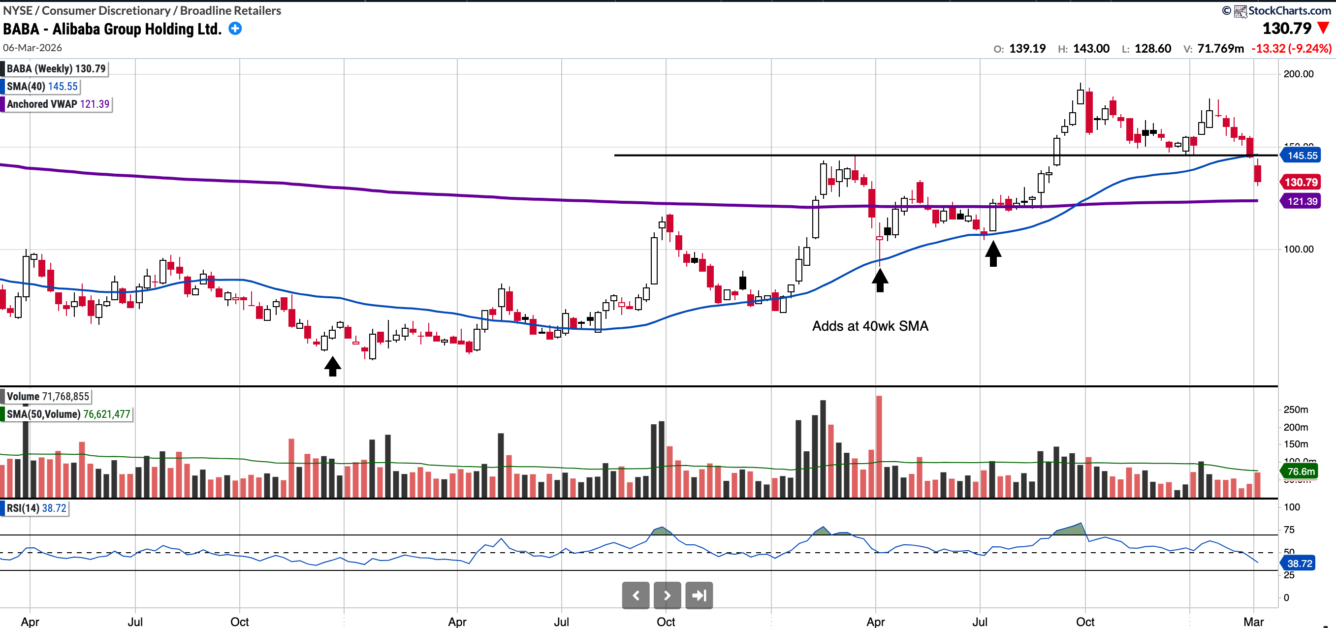 Last week, I noted that $BABA had returned to its 200-day SMA for the first time since July 2025. While the stock has historically held this level and responded favourably, the current geopolitical environment has changed the dynamic and in fact $BABA has lost the 200-day SMA convincingly.