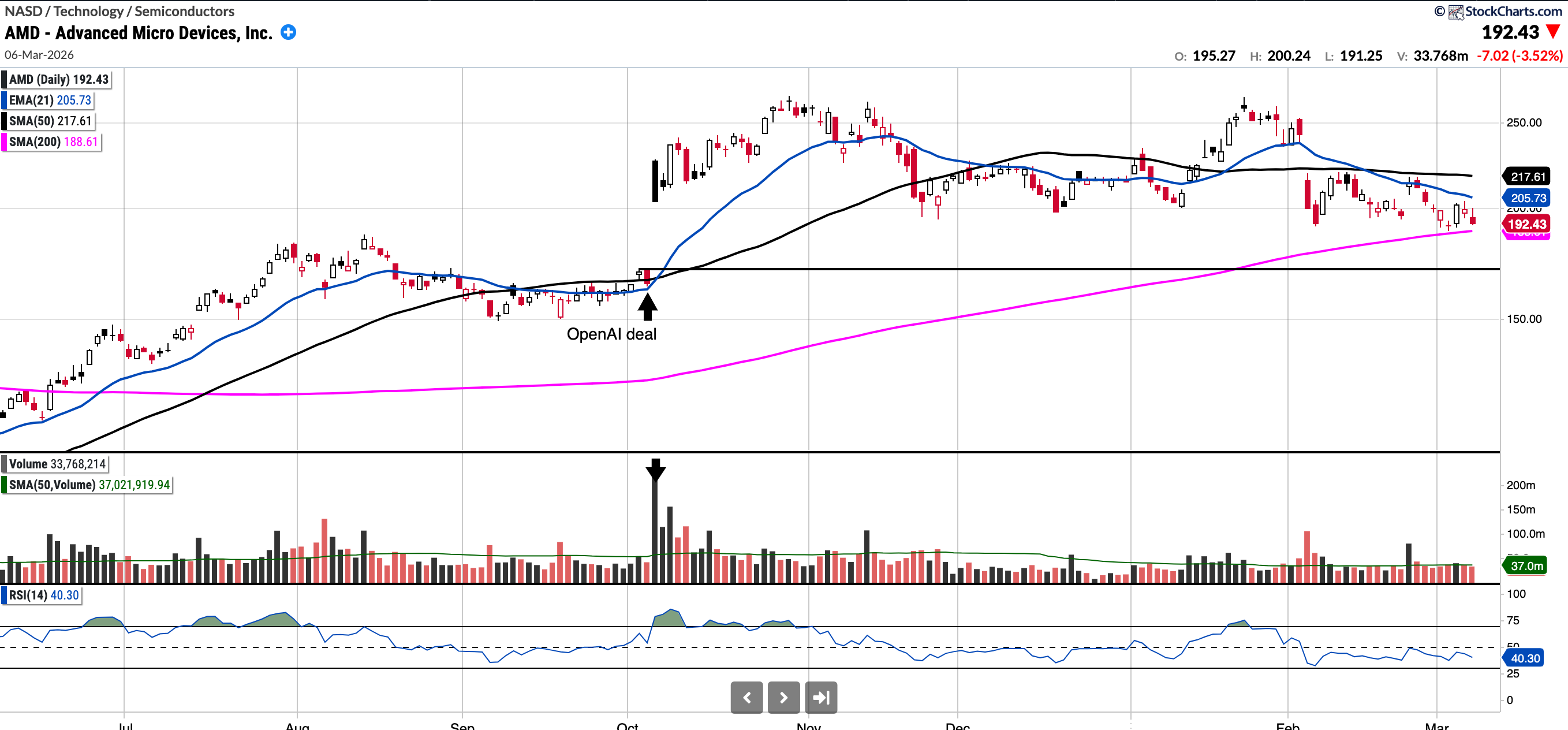 AMD has been trading weakly of late, moving in tandem with other semiconductor names. It is currently approaching the 200-day SMA, which it successfully defended earlier in the week. However, if this level is broken, I believe it could retrace to fill the gap created in early October following the OpenAI news. This would put the price at approximately $170.
