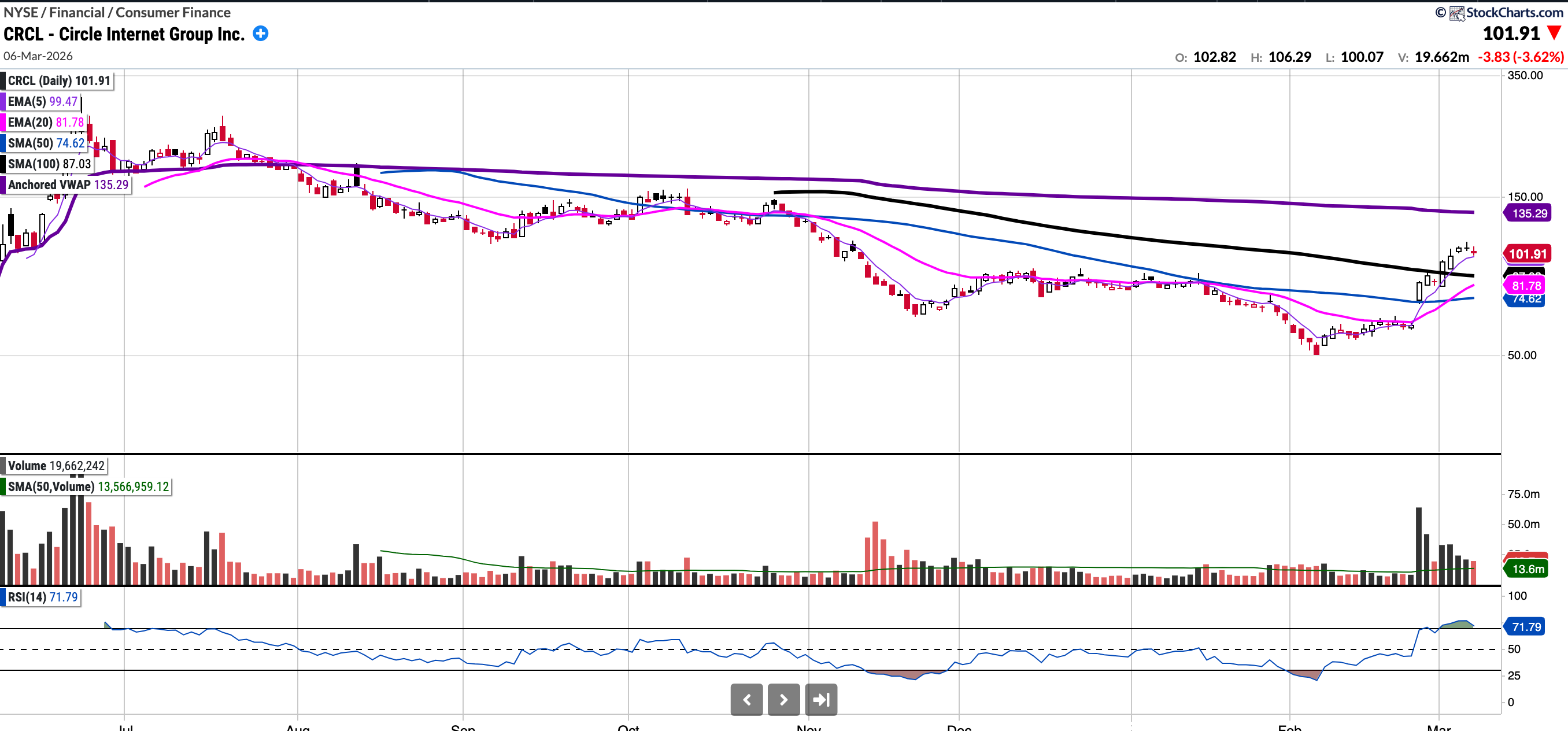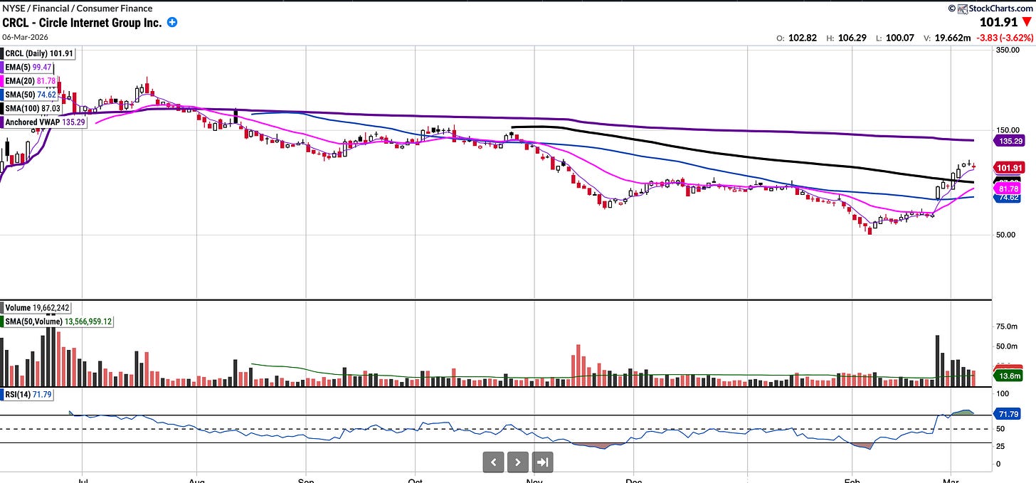 The stock is currently trading above all key moving averages. The $135 level, which represents the AVWAP from its IPO, appears to be a significant technical level that may act as resistance. While I like $CRCL, I do also have a position in COIN. A pullback to the low $80s would likely present a much more interesting entry point.