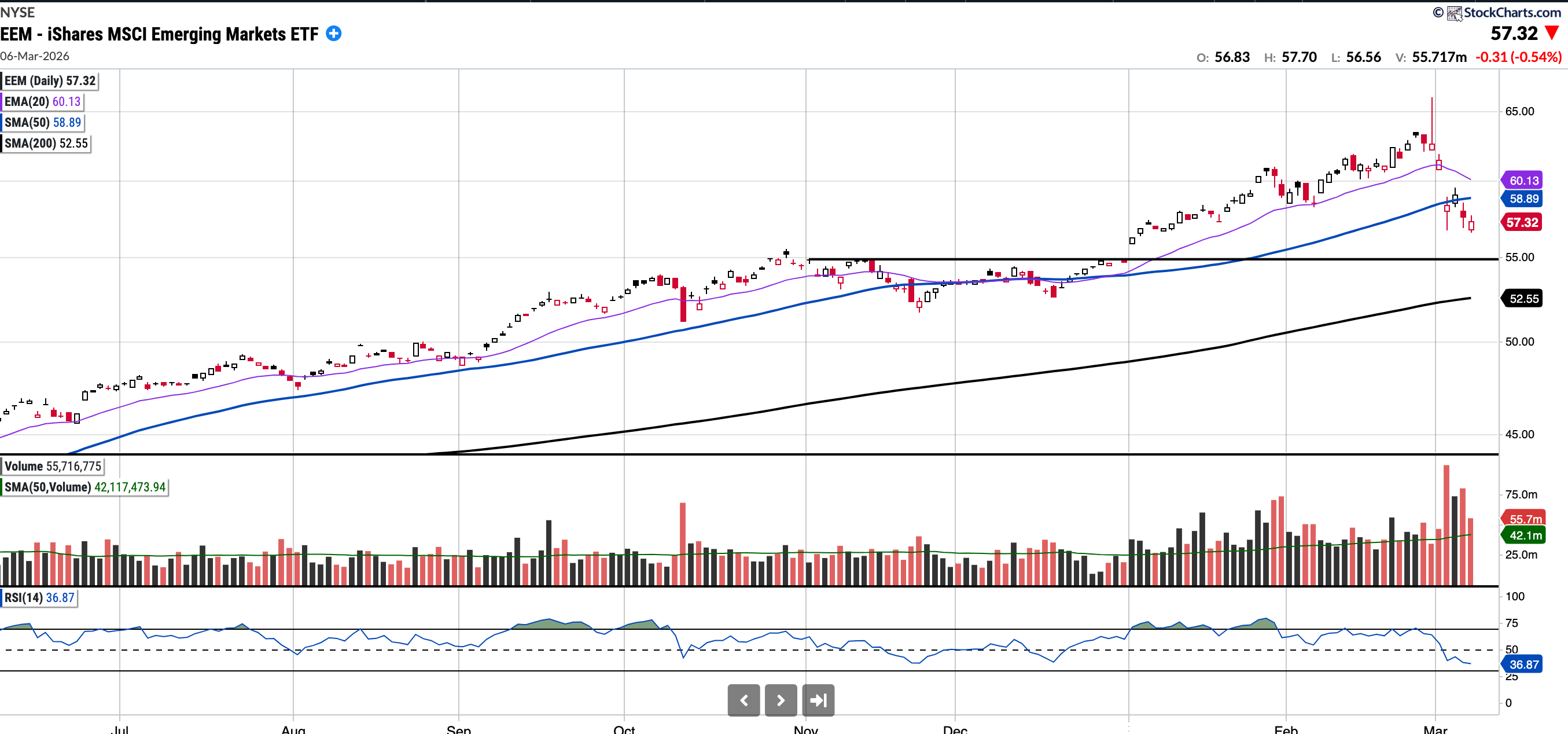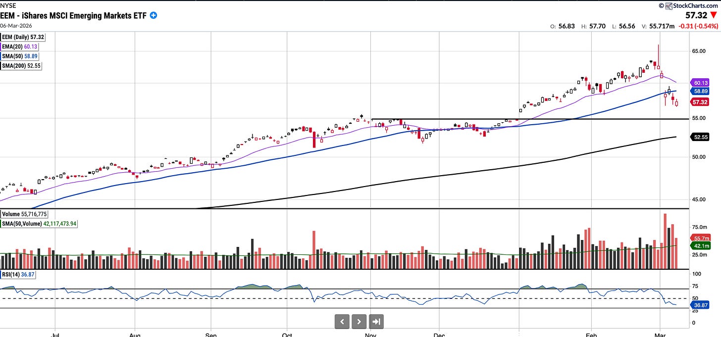$EEM has been outperforming massively year-to-date, but it has pulled back sharply over the last week amid the events in the Middle East. It remains in an uptrend; however, the levels to watch for pullback buys are $55 and, below that, the ascending 200-day SMA at $52.55. I suspect these levels may be tested in the coming days.