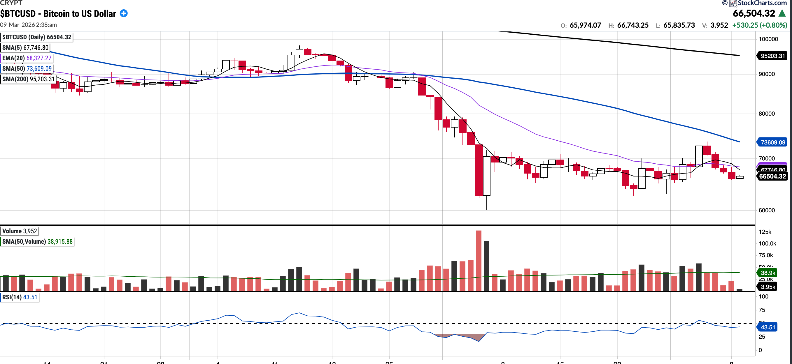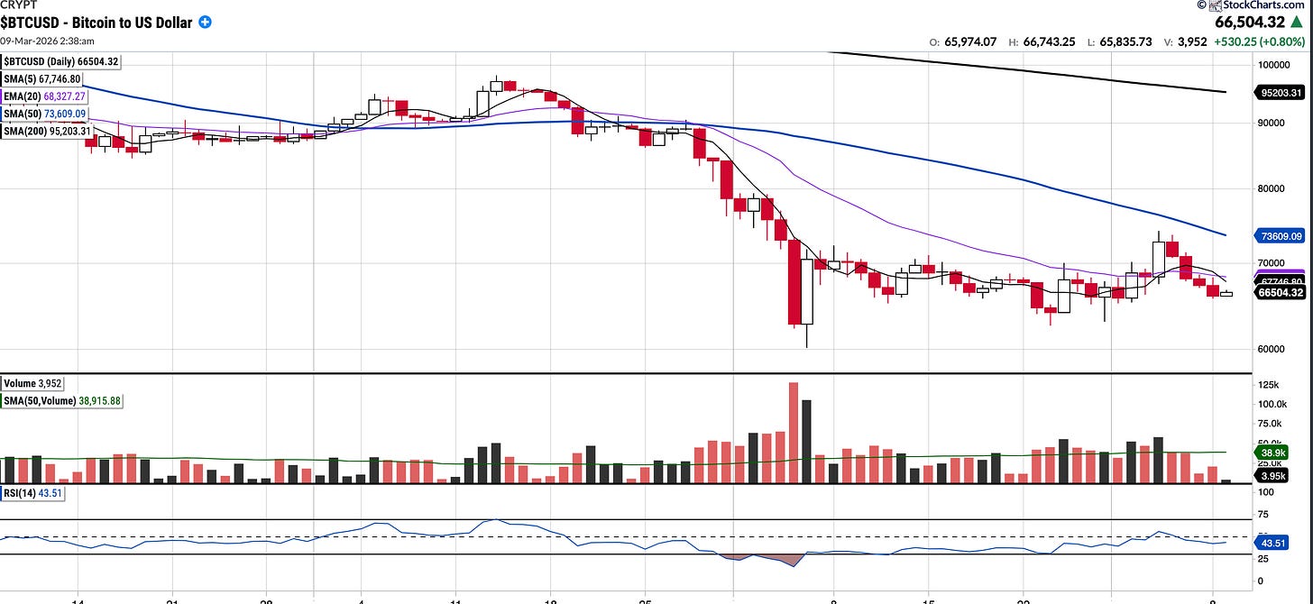Currently trades at $66,504.32, 9.62% below the 50SMA and 30.12% below the 200SMA.