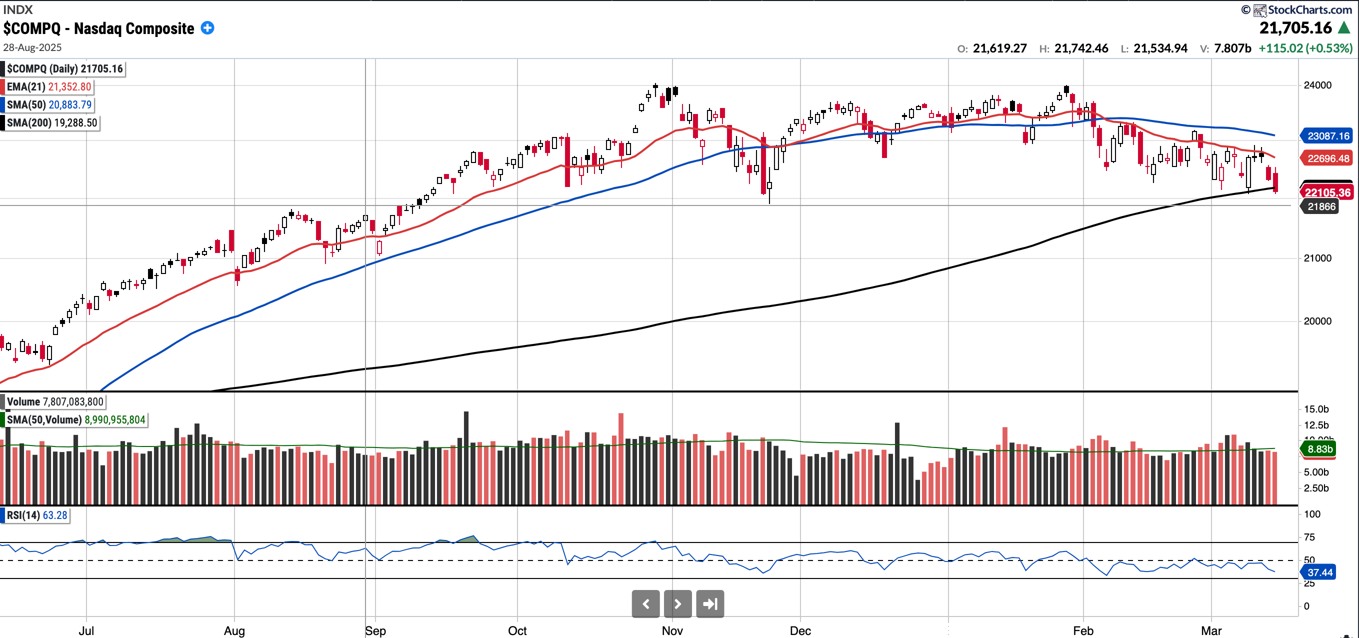 The Nasdaq Composite had a volatile week, with one distribution day (but two days down 0.9% or more), and it remains below both the 21-day EMA and 50-day SMA.