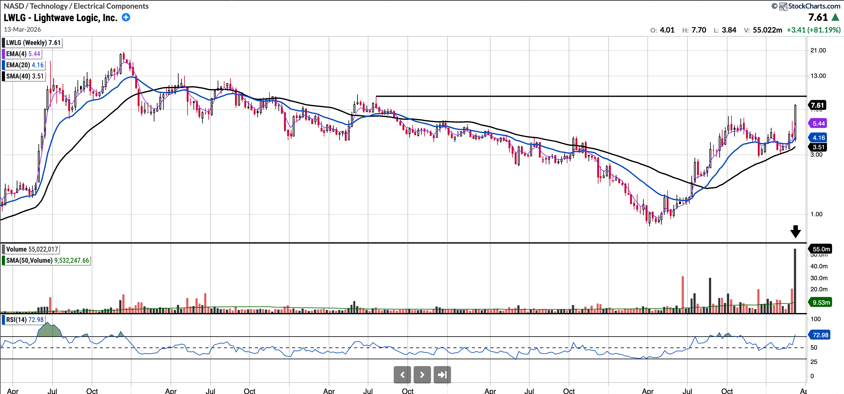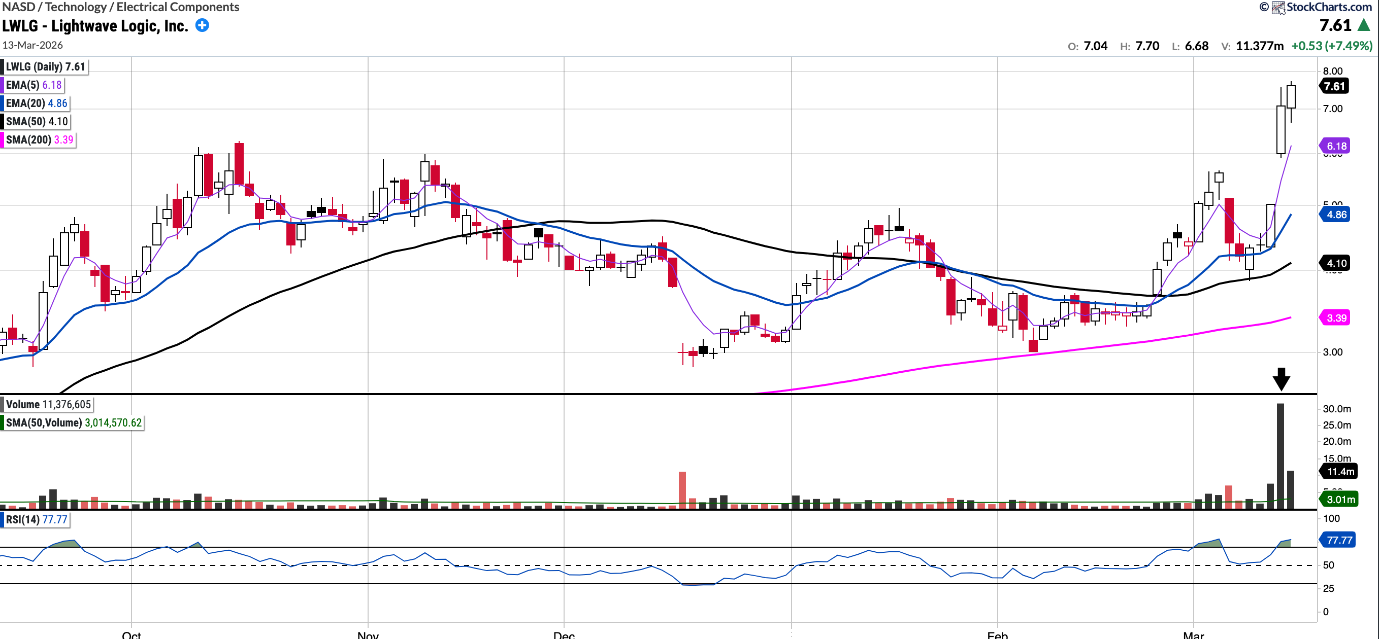 LWLG focuses on the development of photonic devices and electro-optical polymer materials systems for fiber-optic data communications, telecommunications, and optical computing markets in the United States. It recently printed highest volume ever daily and weekly candles, subsequent to a landmark development agreement with Tower Semiconductor ($TSEM). This gives them commercial validation.