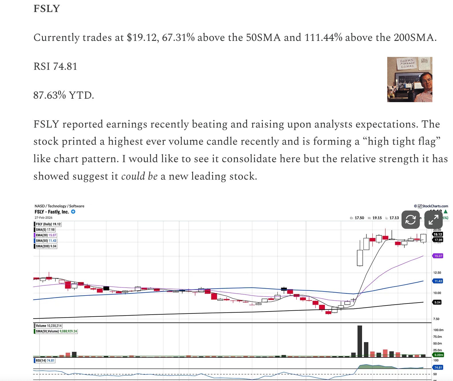 I featured FSLY a couple of weeks ago (see below), and it is up >35% since then. I ultimately did not get positioned. On reflection, when it did offer an opportunity, such as a pullback to the 5-day moving average, other names were also down, which is where my focus remained. It is no doubt extended in the near term but is certainly a leading stock in the market right now. It remains on the watchlist, and I will see if I can get positioned.