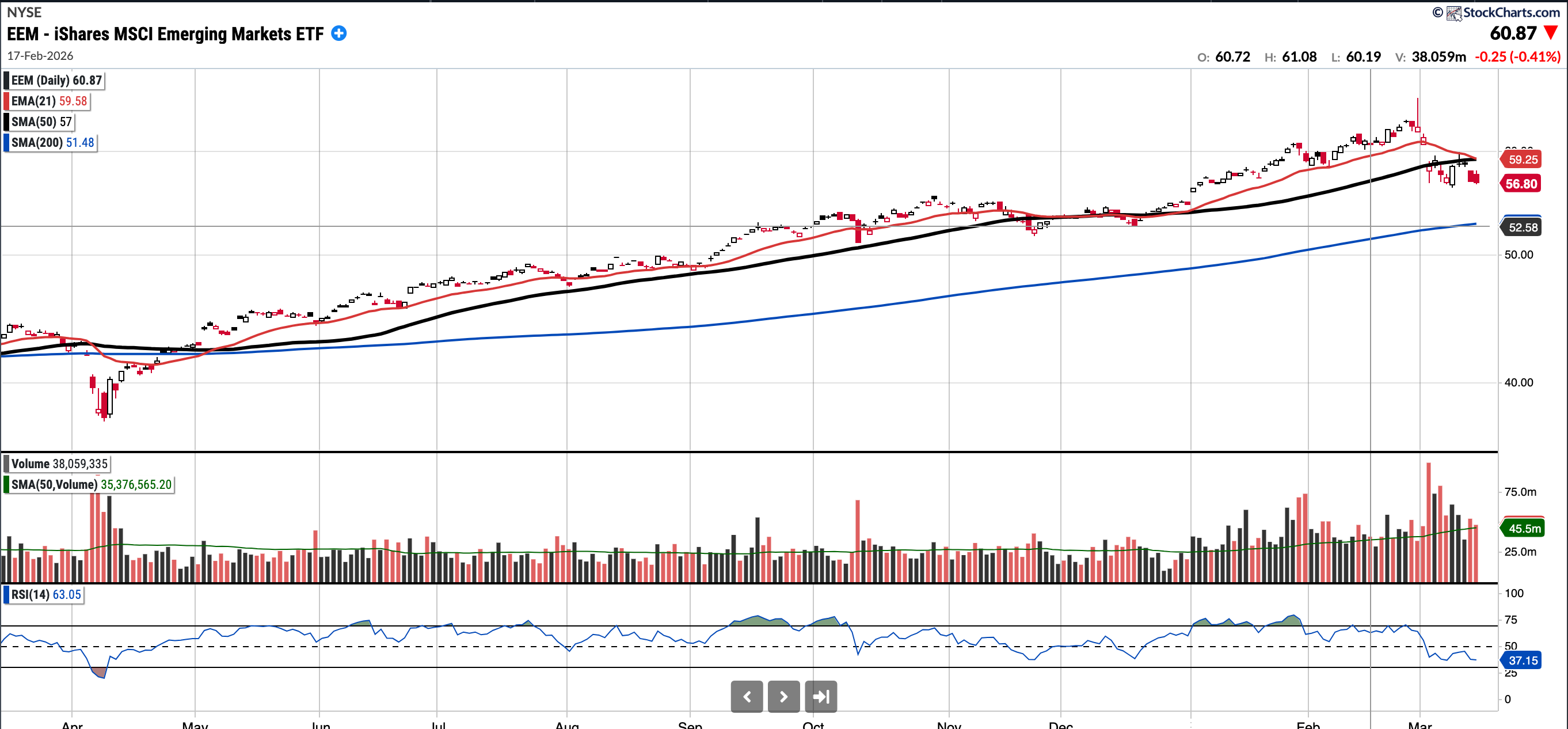 $EEM has been outperforming the U.S. indices comfortably year-to-date, but it has pulled back sharply over the last couple of weeks amid events in the Middle East. It remains in an uptrend; however, the levels to watch for pullback buys are $55.00 and, below that, the ascending 200-day SMA at $52.58. I suspect these levels may be tested in the coming weeks.