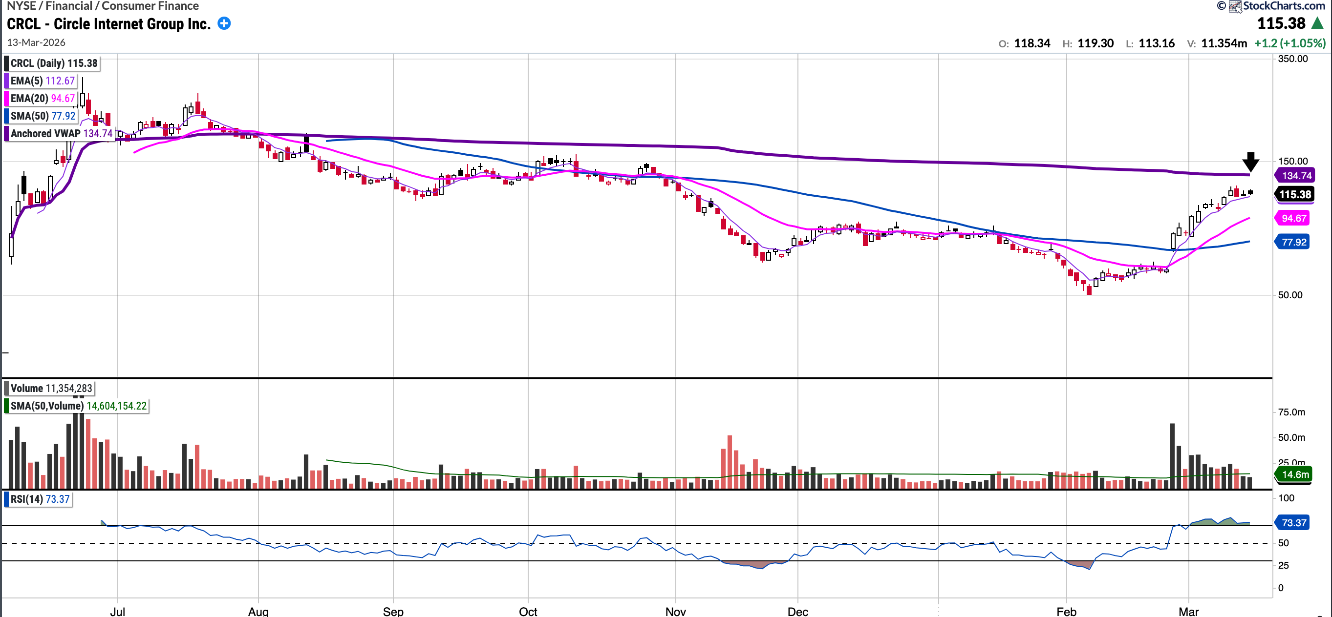 The stock is currently trading above all key moving averages and has been riding the 5SMA on it’s recent rise.The $135 level, which represents the AVWAP from its IPO, will be a significant technical level that may act as resistance.