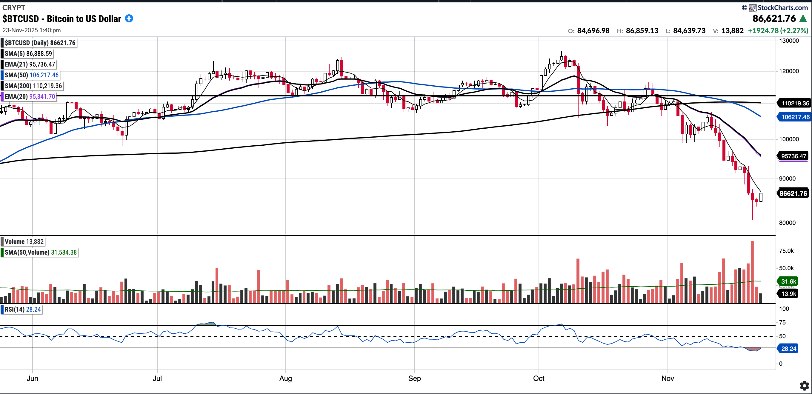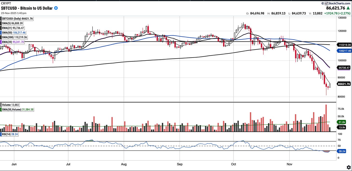 Currently trades at $86,625.80, 8.25% below the 50SMA and 21.40% below the 200SMA.