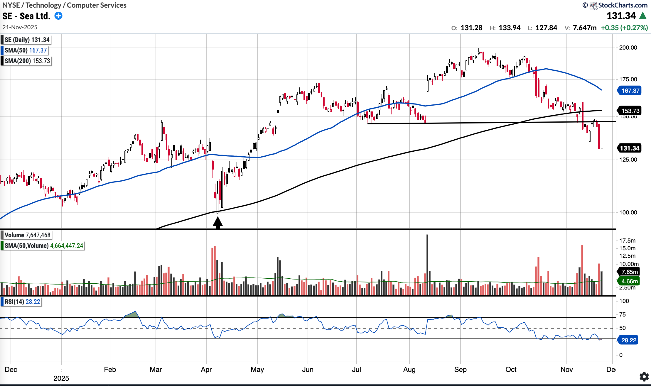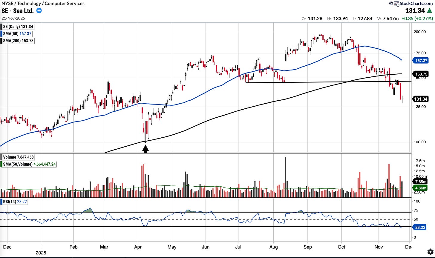 SE stock has recently lost all key moving averages and the horizontal $145 support, although buyers have tended to step in at the 129/130 level. Substantial work is required for the chart to become constructive again and one can not claim it has bottomed based on the evidence.