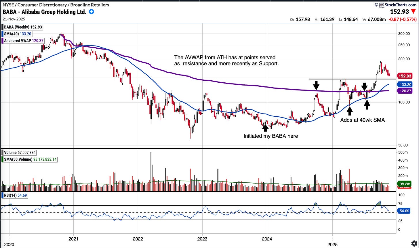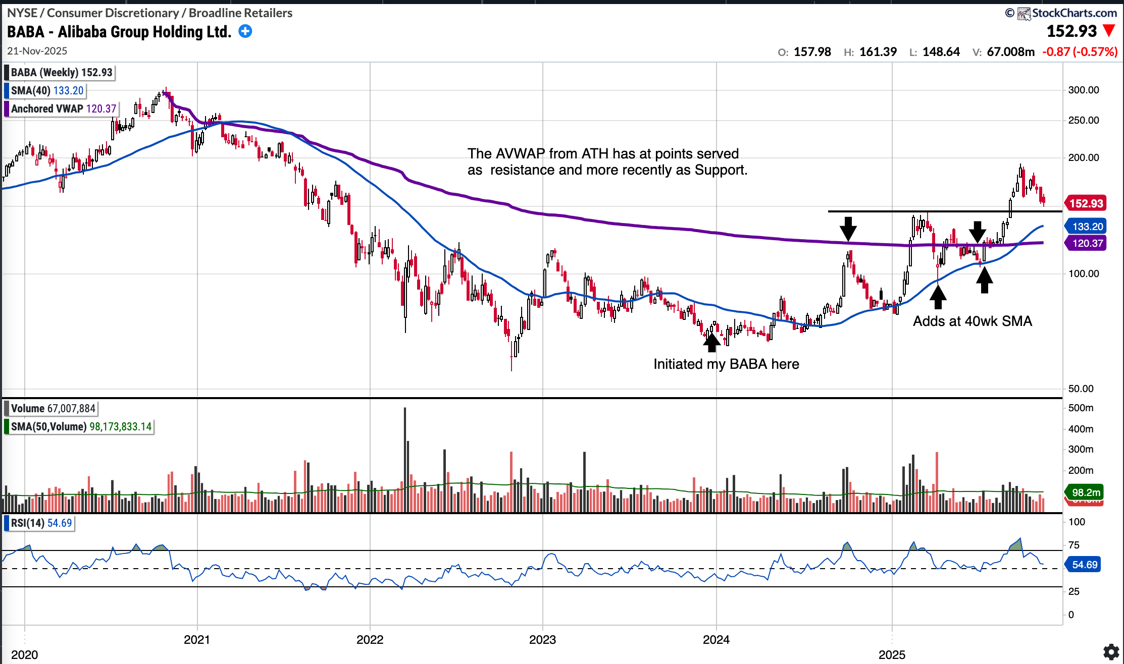The AVWAP from ATH has been a level of interest for the last couple of years for BABA. It has at times served as resistance and more recently as support. The AVWAP sits at 120.37. Otherwise, the 40 week SMA is a level I will likely add to my BABA holdings, especially now that I am down to a small core. Note, BABA does report on Tuesday.