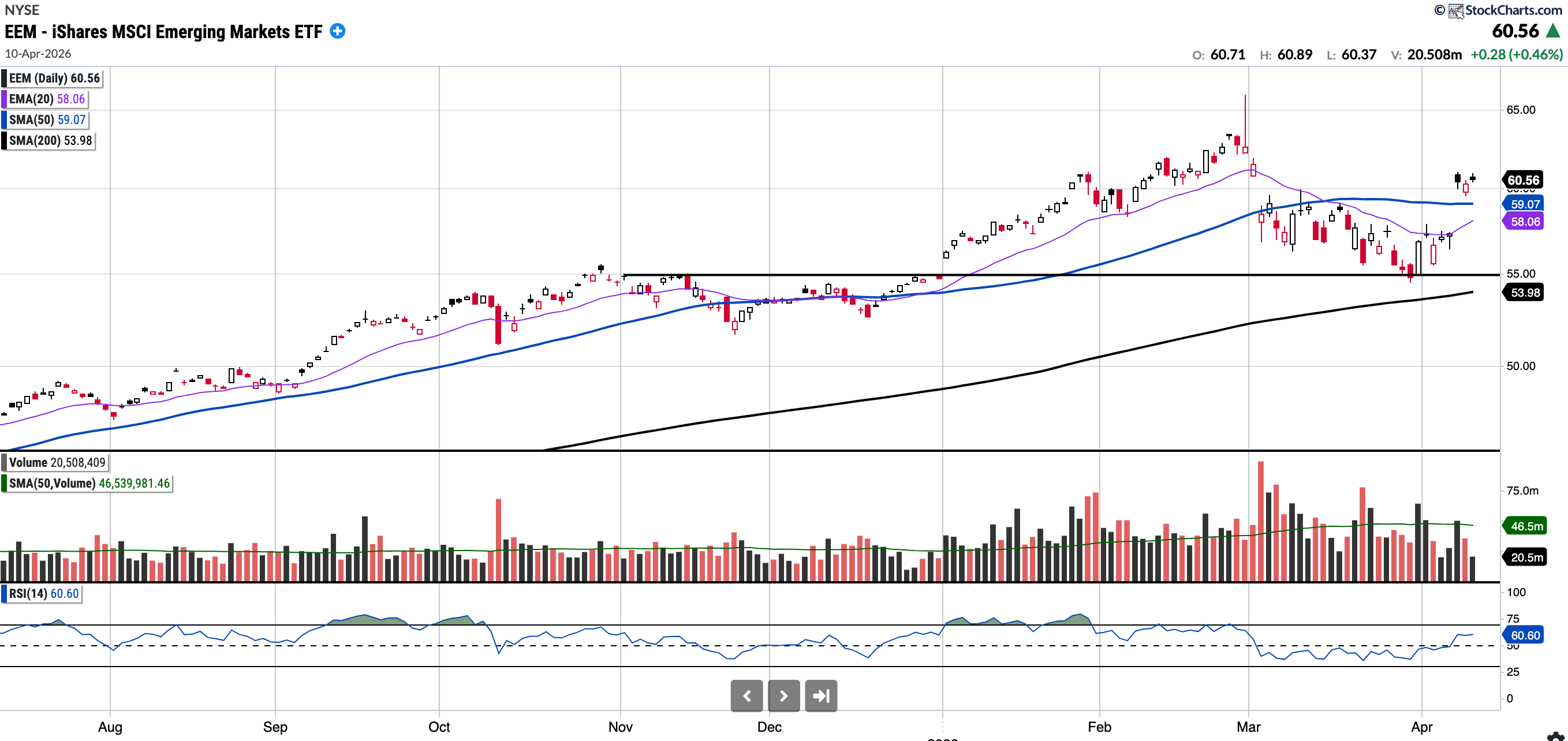 EEM remains in an uptrend; however, the levels to watch for pullback buys are at the SMA at 59.07 and then $55.00 (horizontal support). If the $55.00 support level is lost, the 200-day SMA will come into play. I believe EEM could be setting up for multi-year out performance hence I continue to watch it closely.