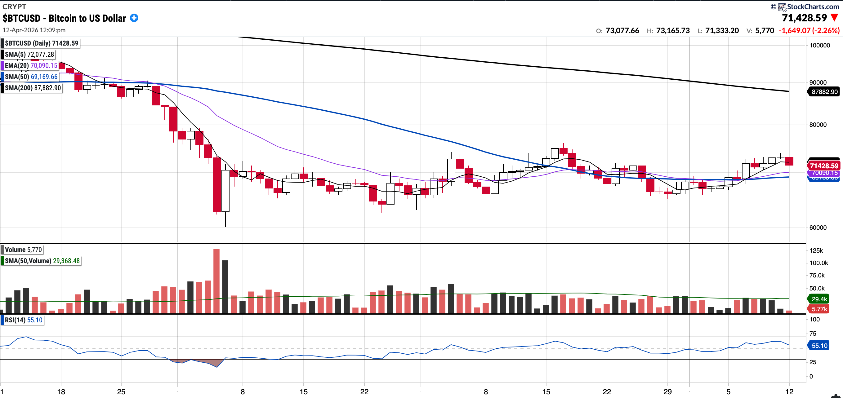 Currently trades at $71,428.59, 3.27% below the 50SMA and 18.72% below the 200SMA.
