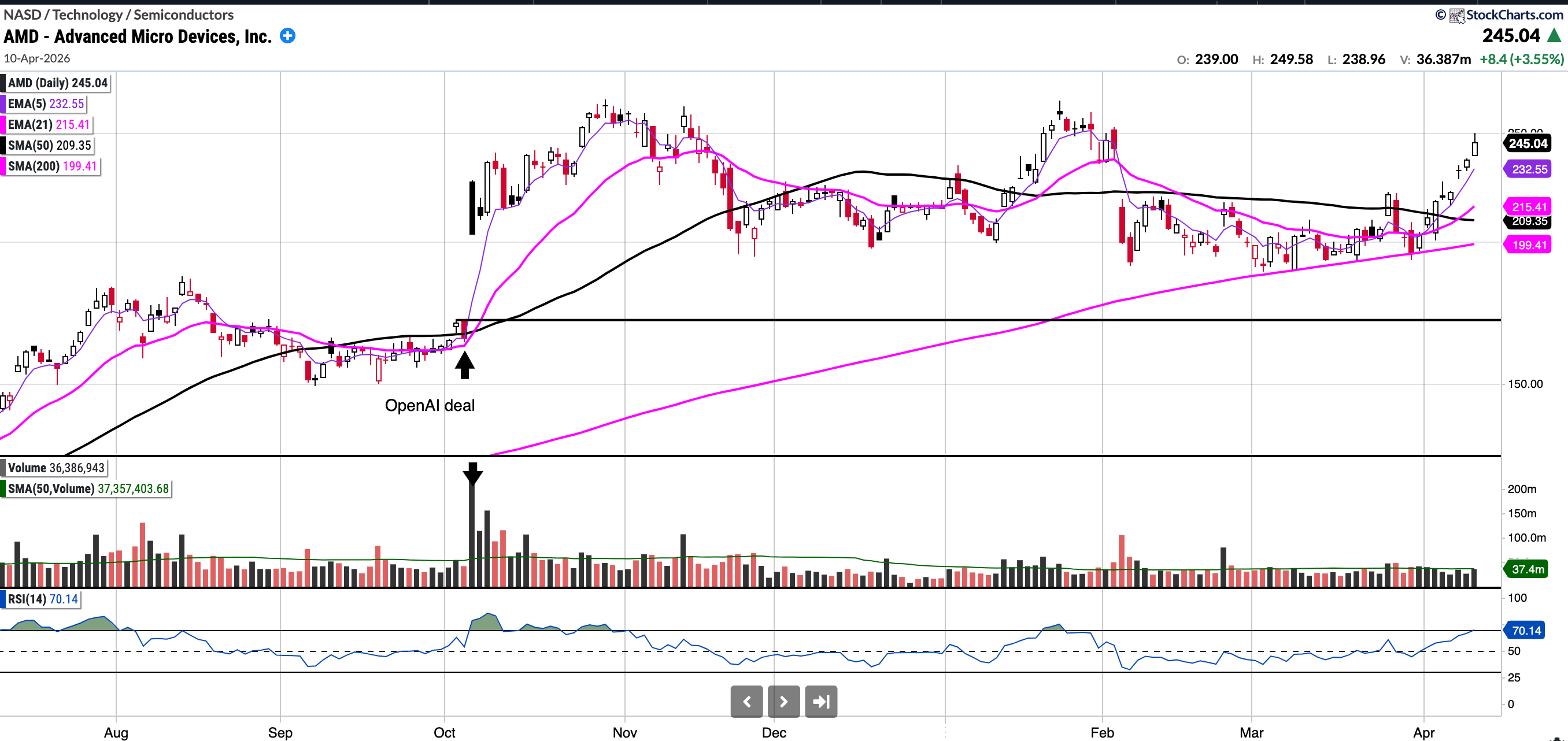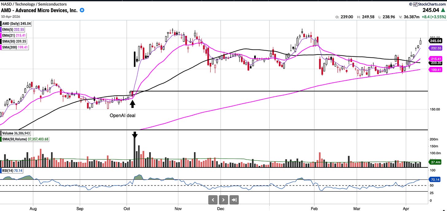 AMD closed at 245 and was up roughly 30 points on the week. AMD continues to show good strength; however, since semis are very overbought right now, I would not be surprised to see some backfill and perhaps a test of the SMA 50 or even the SMA 200 again.