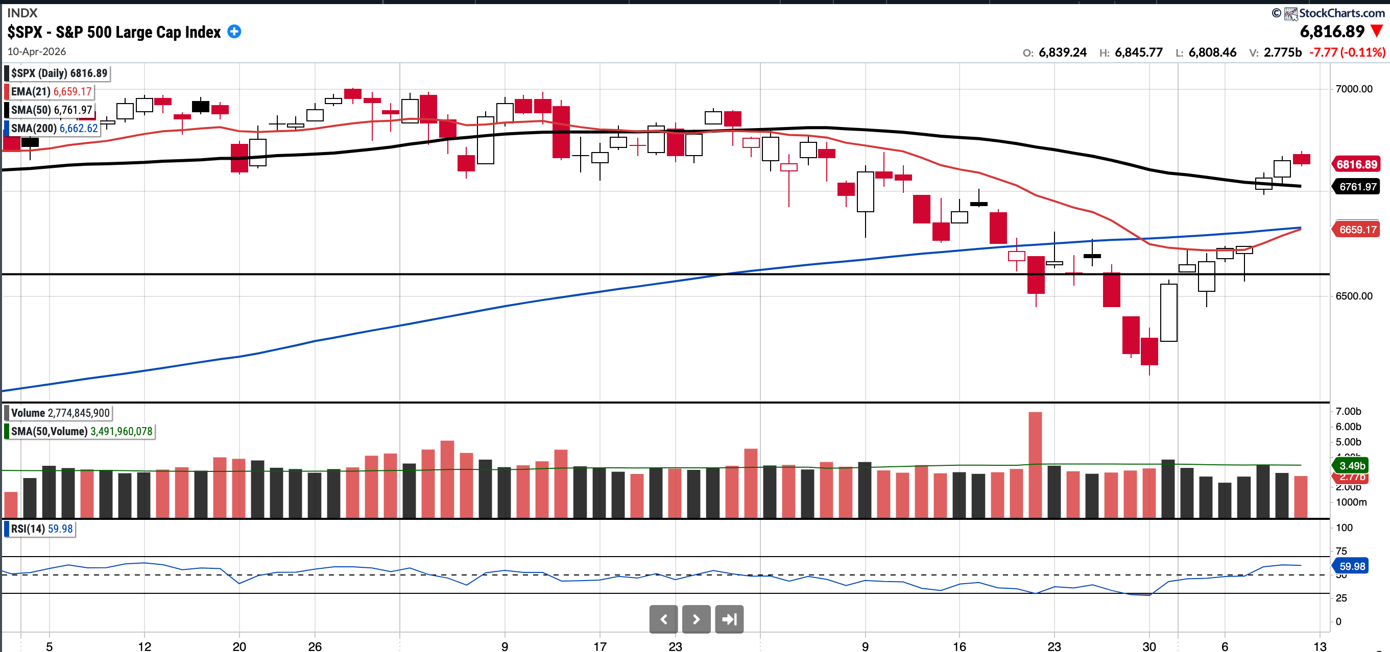 Currently trades at 6,816.89, 0.81% above the 50SMA and 2.32% above the 200SMA.