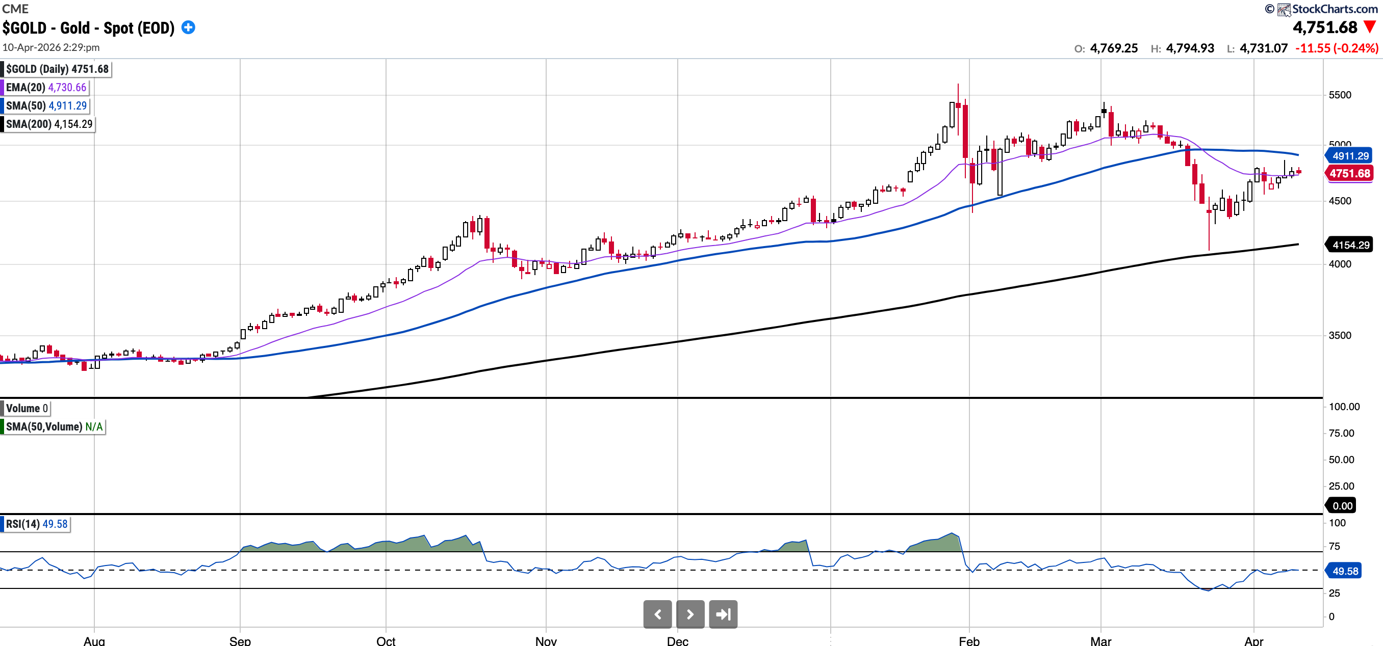 Currently trades at $4751.68, 3.25% below the 50SMA and 14.38% above the 200SMA