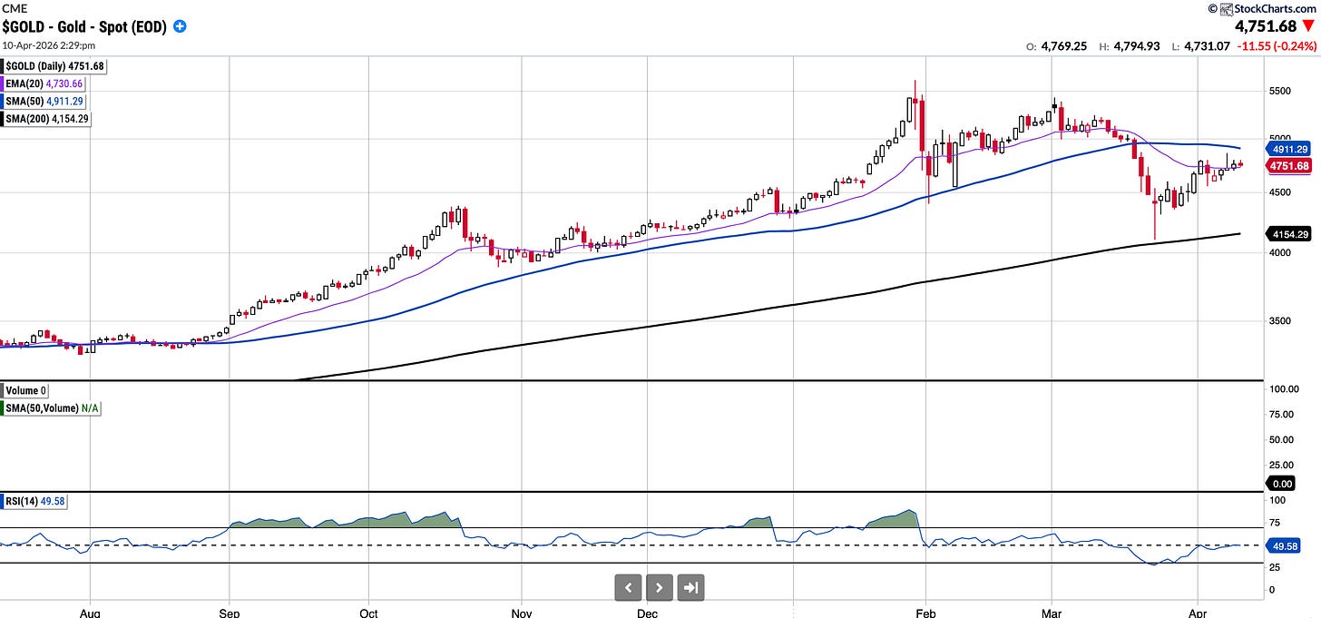 Gold remains in an uptrend, though it is 15% or so off the highs.