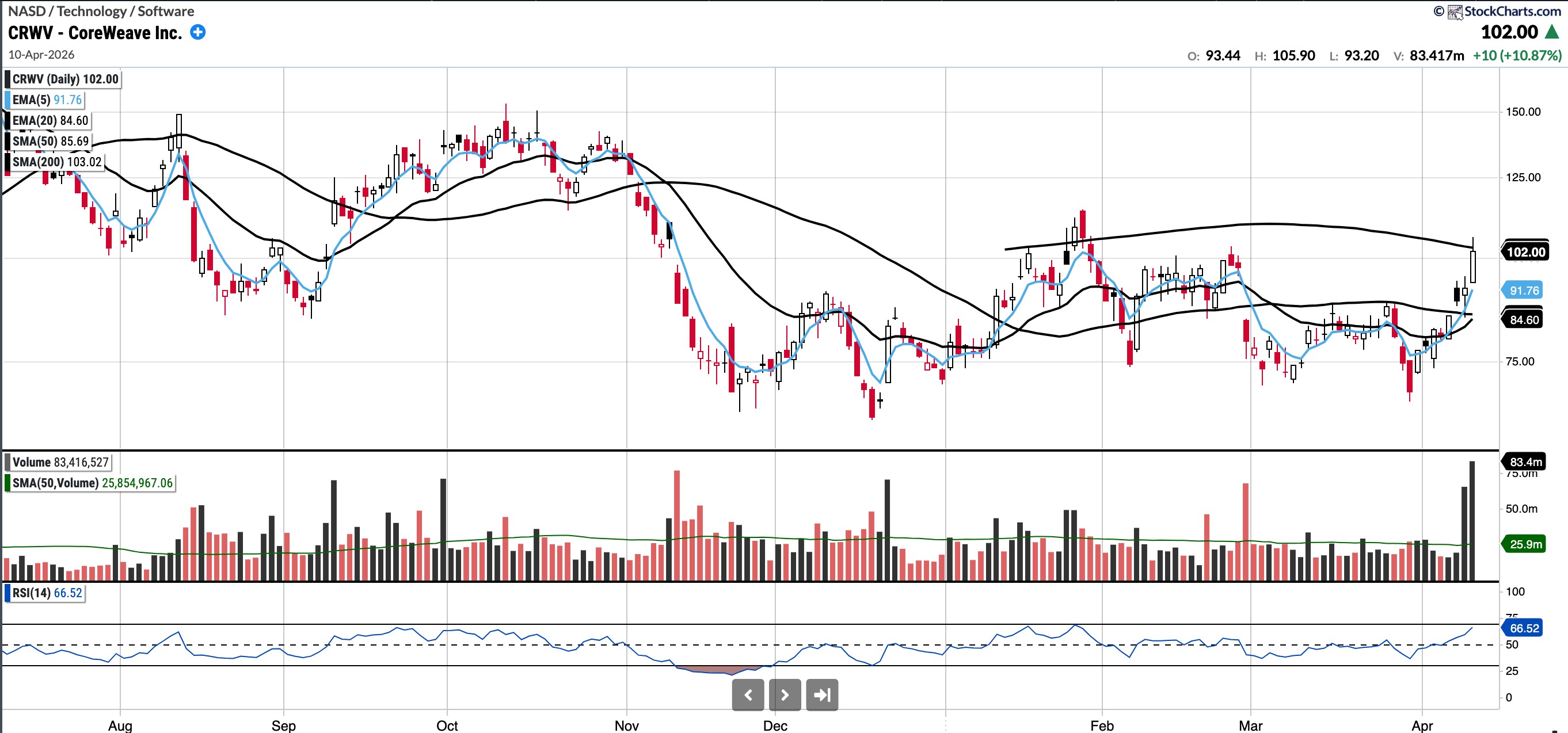 CRWV is trading above its 5, 20, and 50-day moving averages and initially found some resistance at the overhead SMA 200. Notable volume entered the stock in the last two sessions especially. This is one on my watch list where I may enter either on a breakout and re-test of the SMA 200 or if it can pull back and hold the SMA 50.
