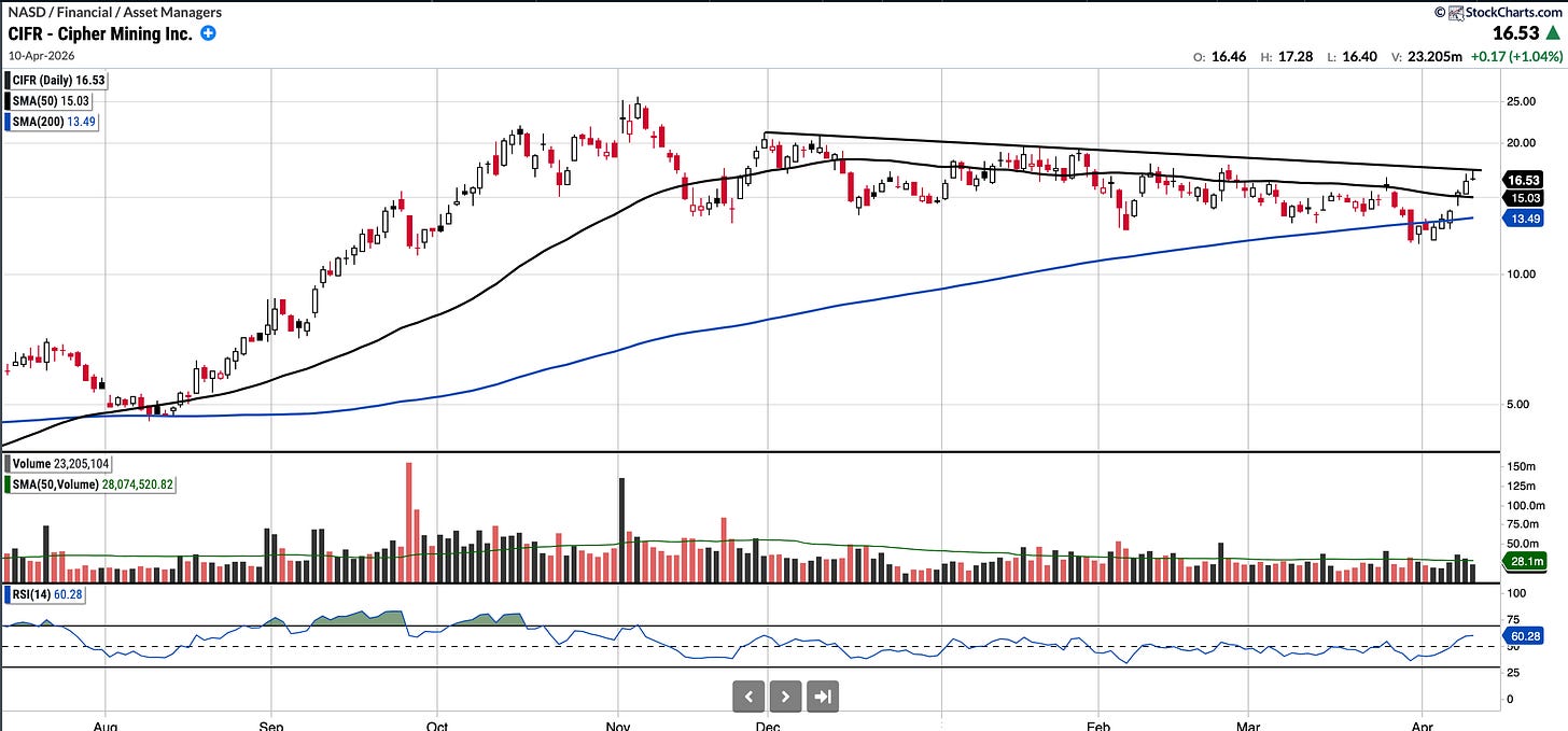 CIFR chart is included below and it could be interesting either on a breakout above the trend-line or on pullback to find support at the moving averages.