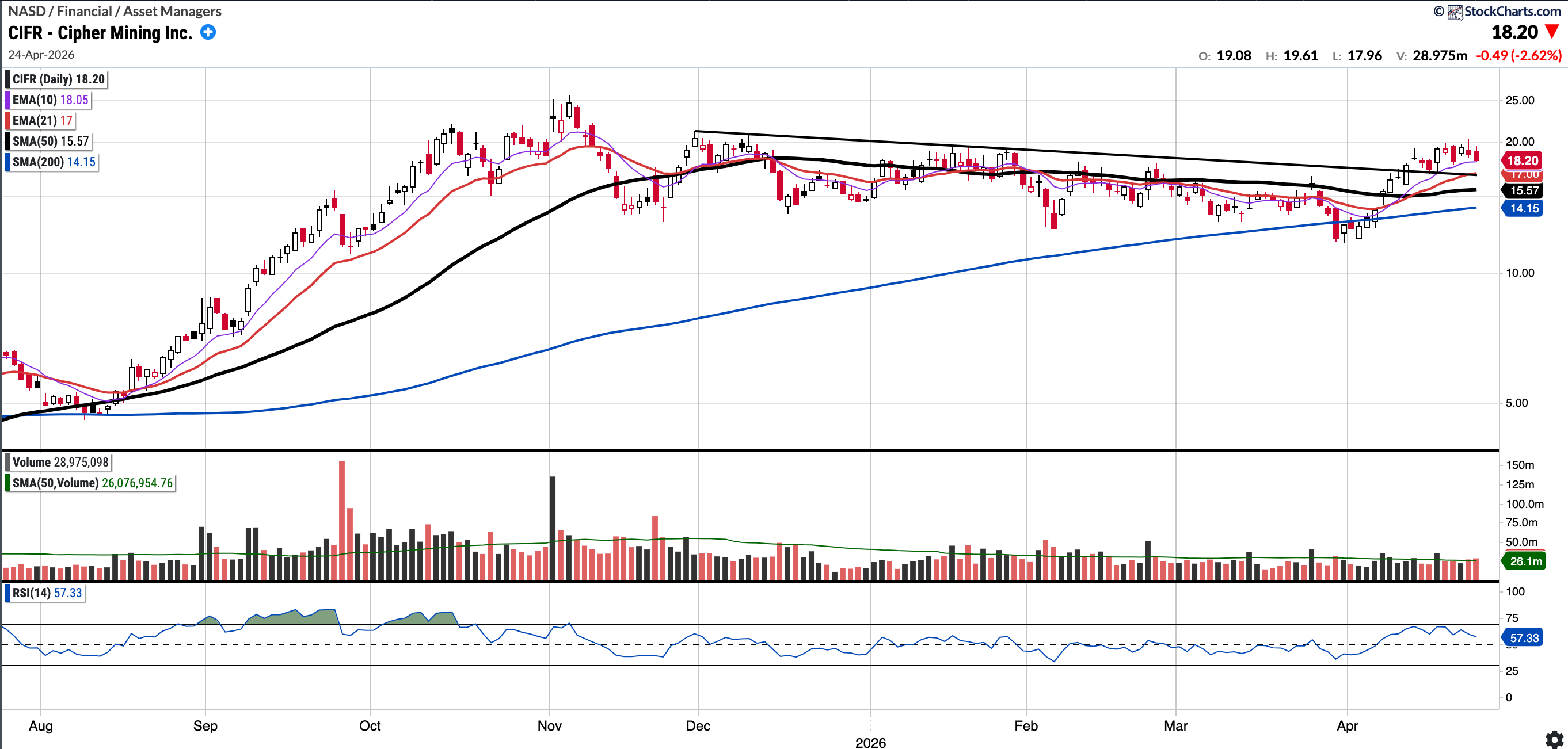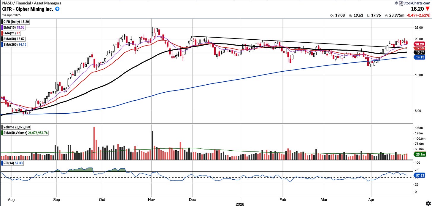 CIFR broke out above the descending trend-line last week; although it finished the week in the red, it successfully held the 10-day EMA as support. I’m looking for a low-volume pullback to the trend-line, which currently coincides with the 21EMA, where I may initiate a long position.