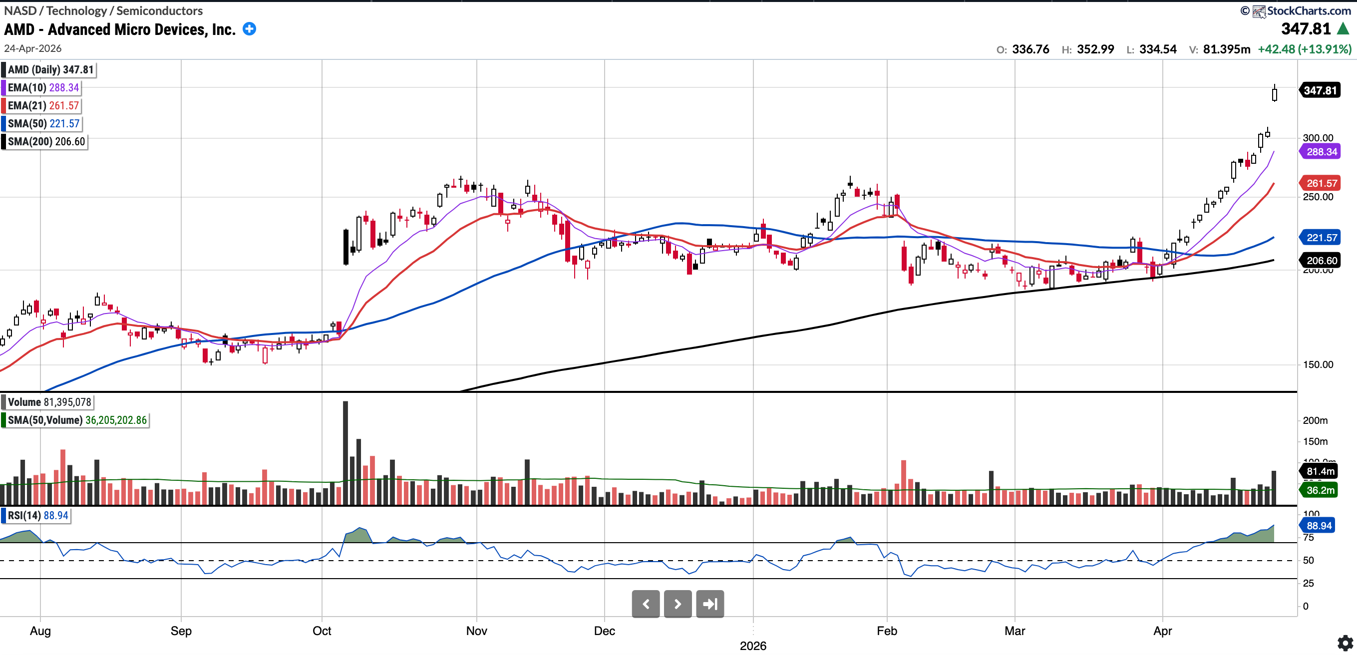 Currently trades at $347.81, 56.97% above the 50SMA and 68.35% above the 200SMA