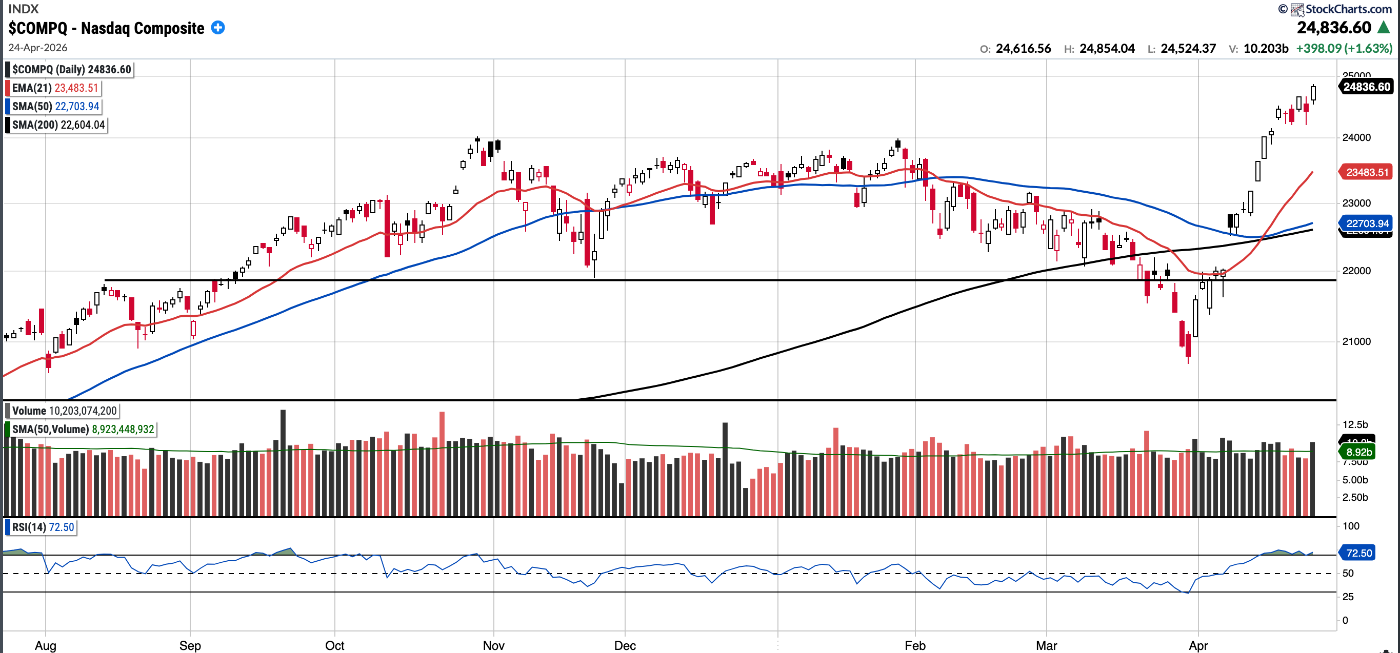Currently trades at 24,836.6, 9.39% above the 50SMA and 9.88% above the 200SMA.