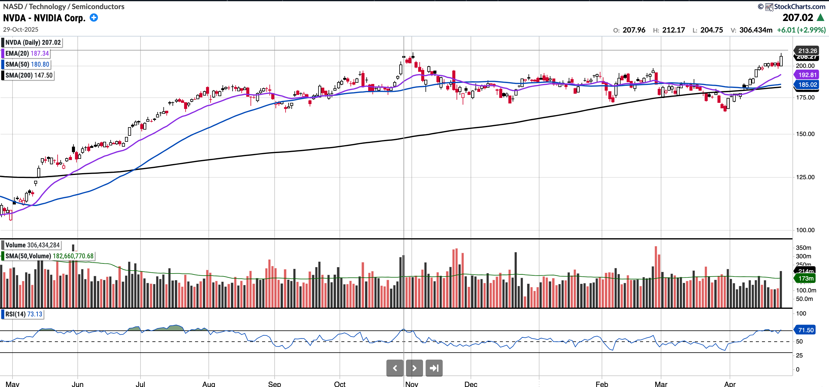 NVDA posted an all-time high close, though it has yet to surpass the intraday all-time high of $212.19 reached in late October. This breakout has been more than six months in the making. The measured move from the previous base is approximately 28 points, which could project NVDA toward $240 per share.