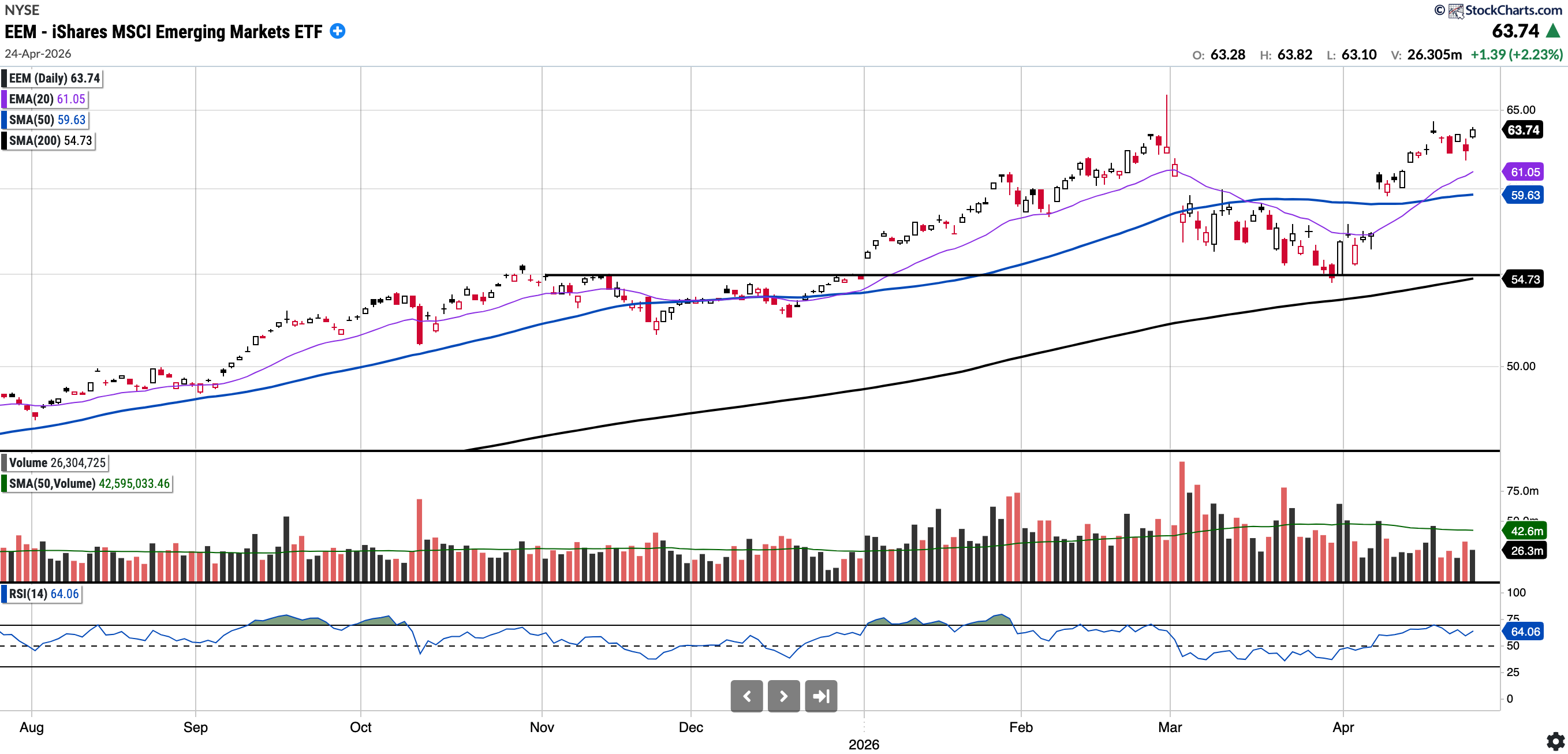 EEM remains in a strong uptrend and continues to outperform U.S. indices comfortably year-to-date by close to 900 bps.