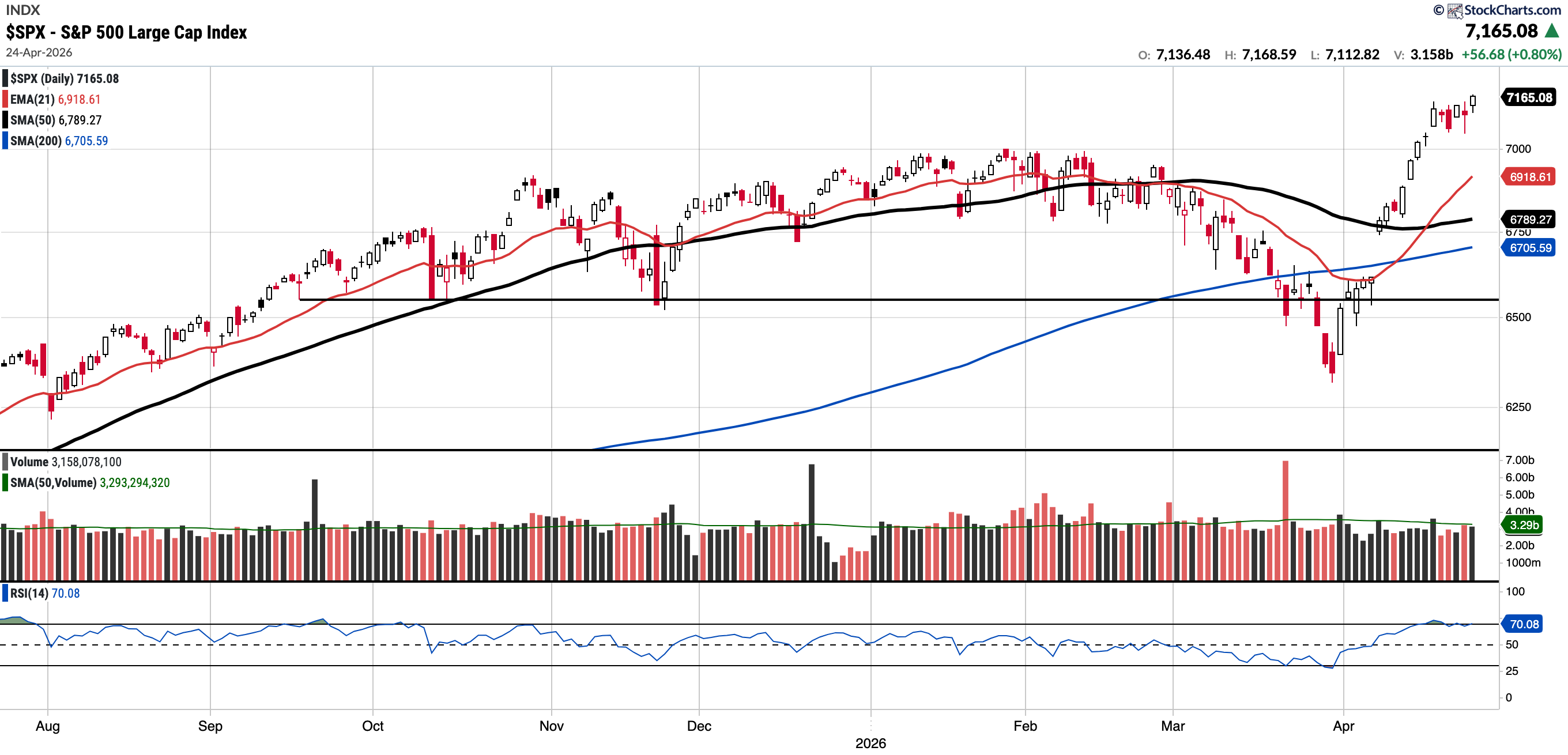 Currently trades at 7,165.08, 5.54% above the 50SMA and 6.85% above the 200SMA.