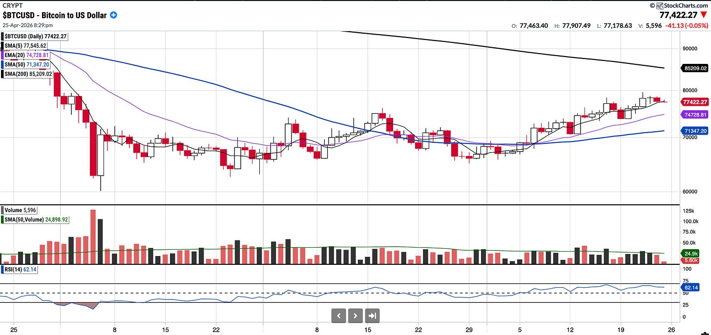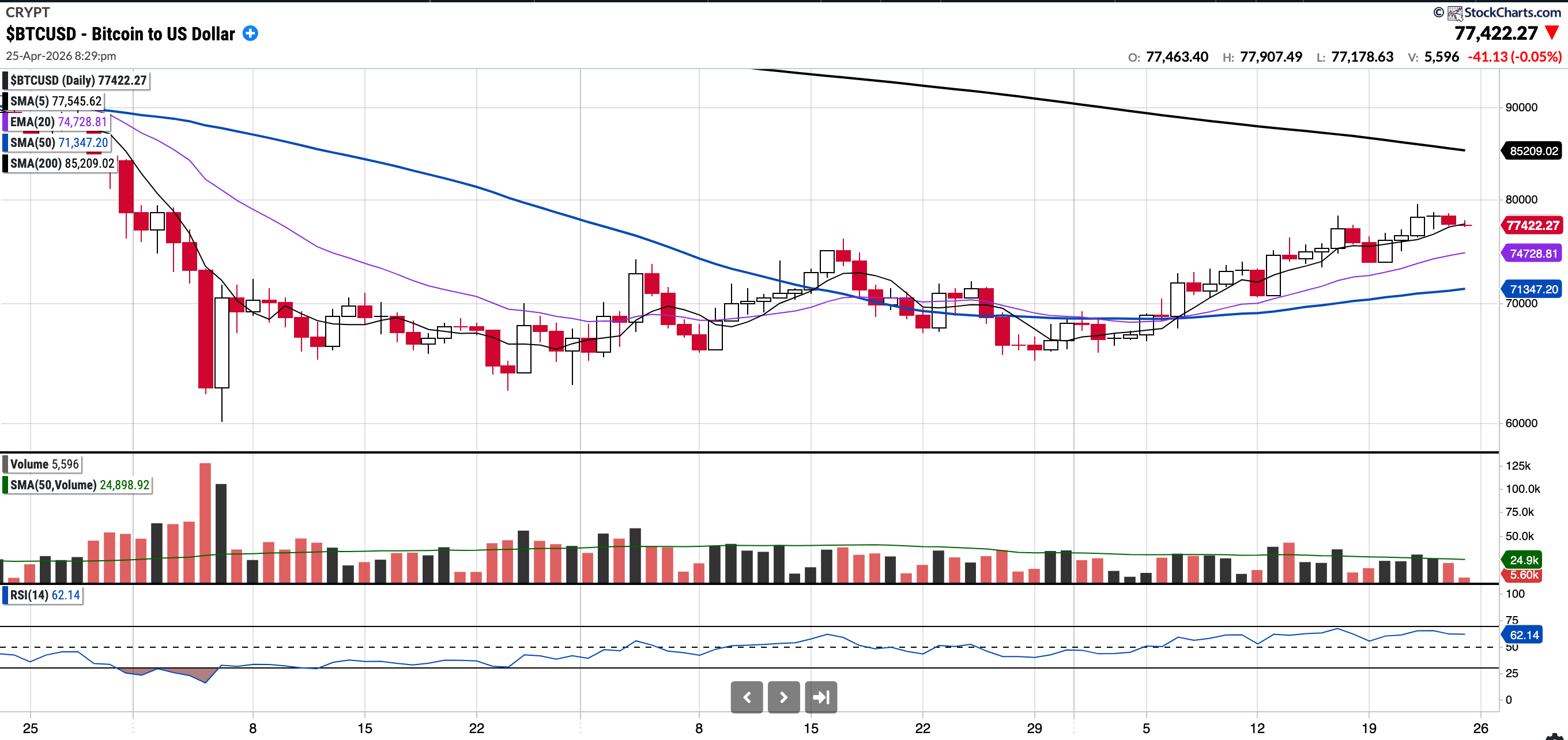 Currently trades at $77,422.27 8.51% above the 50SMA and 9% below the 200SMA.