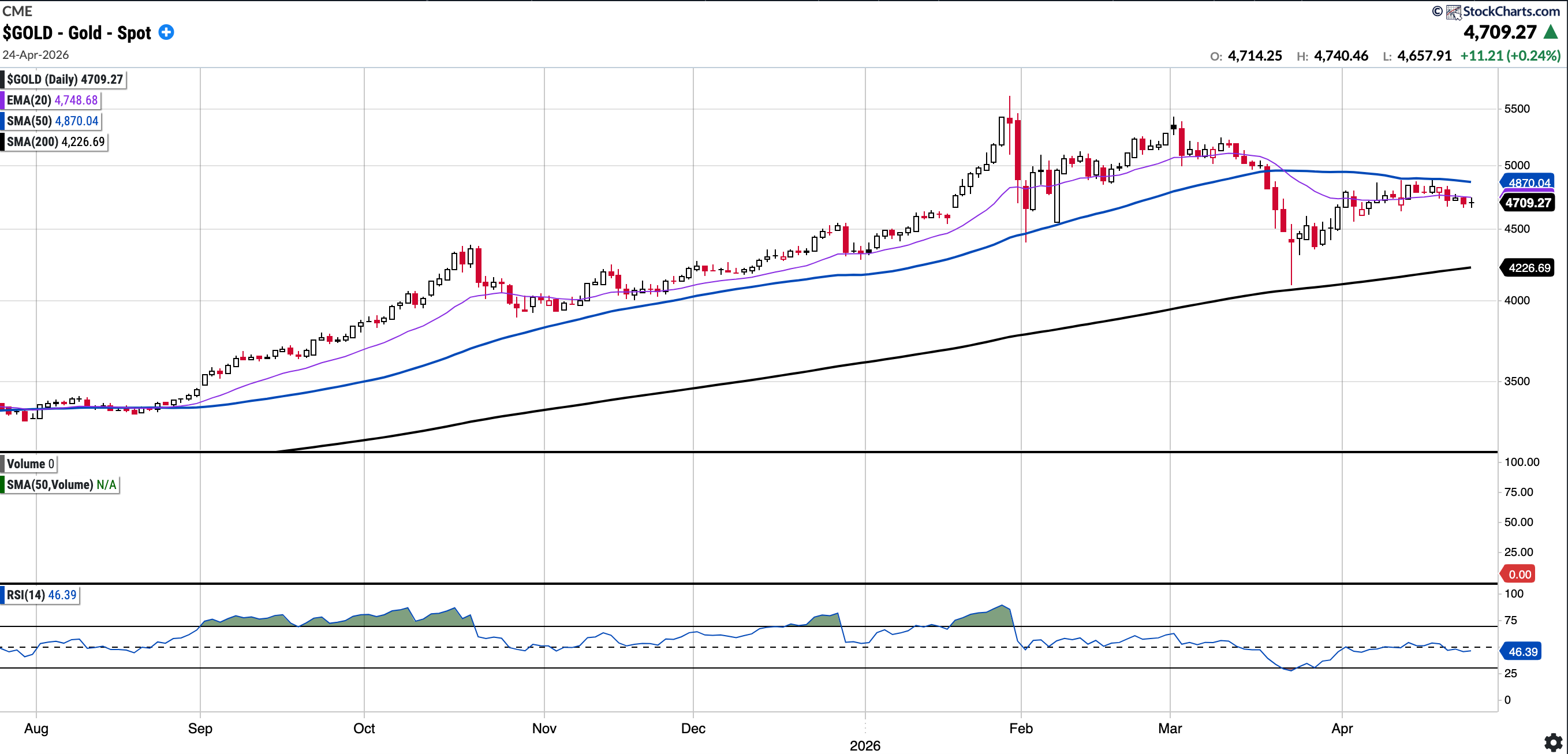 Currently trades at $4709.27, 3.3% below the 50SMA and 11.42% above the 200SMA