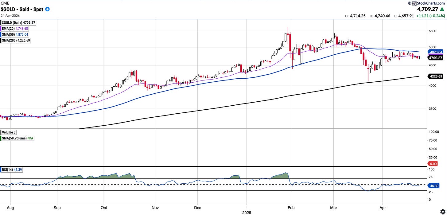 Gold remains in an uptrend, though it has started to consolidate below the overhead SMA 50, which is serving as a strong resistance level.
