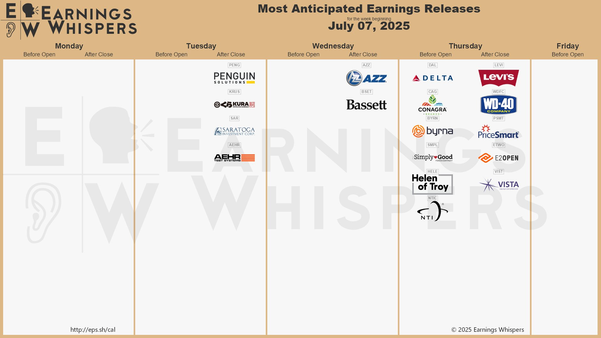 Week starting July 7 is a quiet week for earnings. Second quarter earnings will kick off properly the week after with major institutions like JPM, Citi and WFC scheduled the week starting July 14th. Nevertheless below is the infographic from Earnings Whispers for the upcoming week.