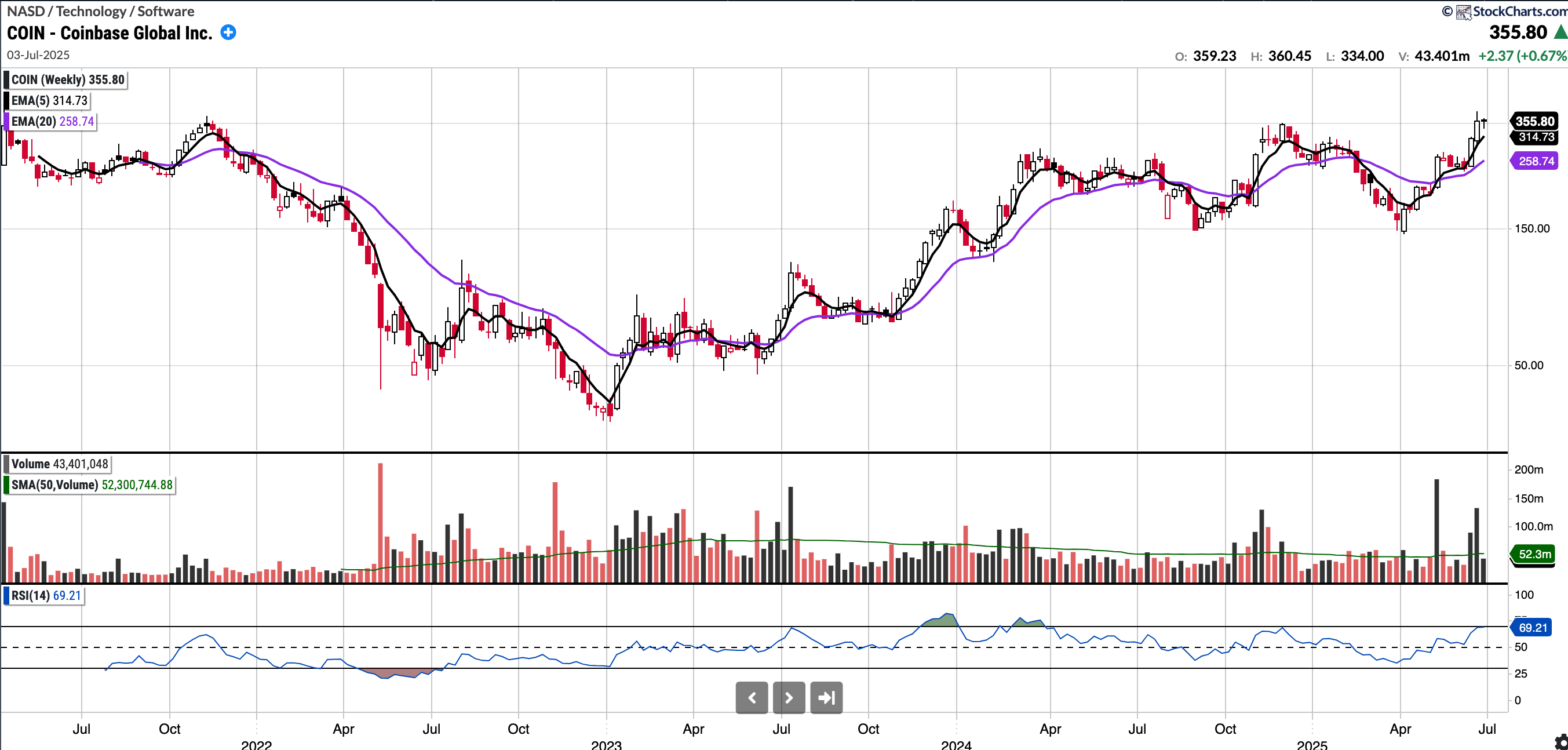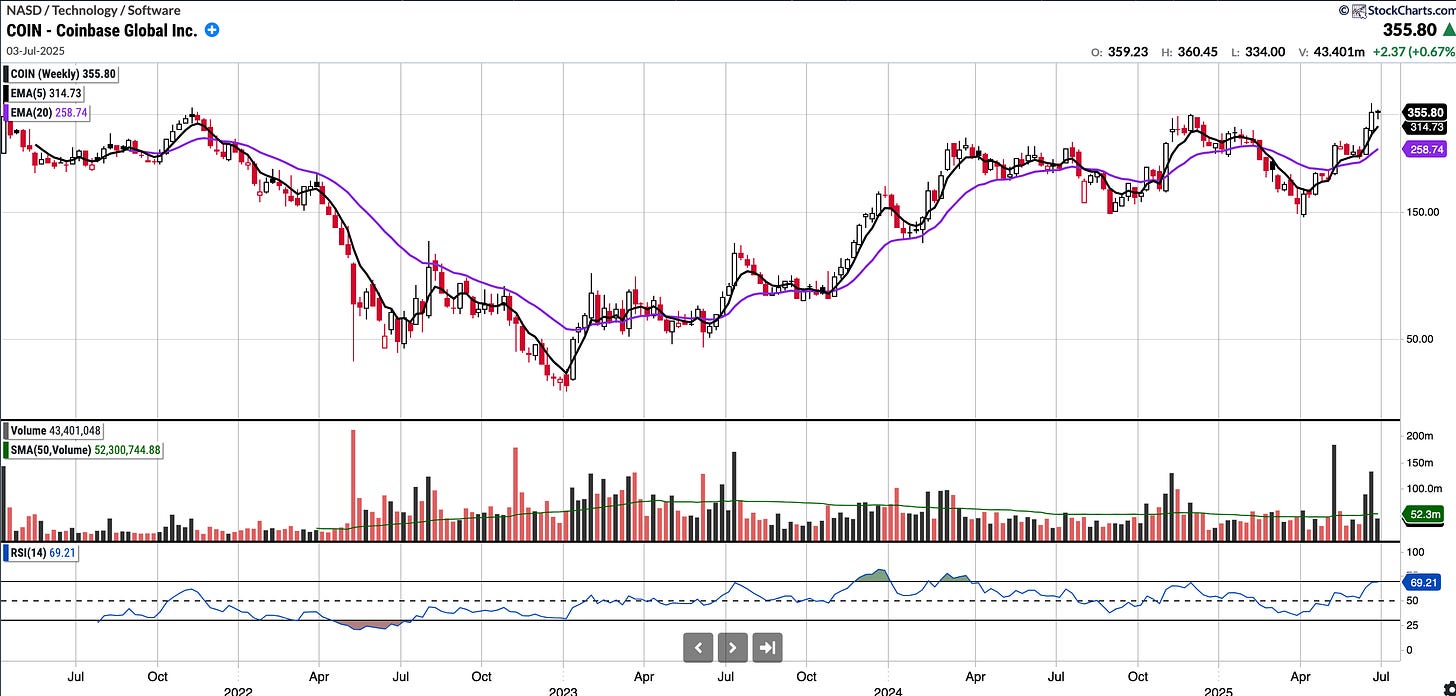 I have been posting about COIN for a while and when was 100 called for 300. Now think 400-420 in play. Chart is a huge cup and handle