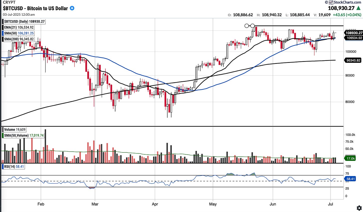 A break above prev ATH of 111,980 is probable. Would be bullish for Crypto equities