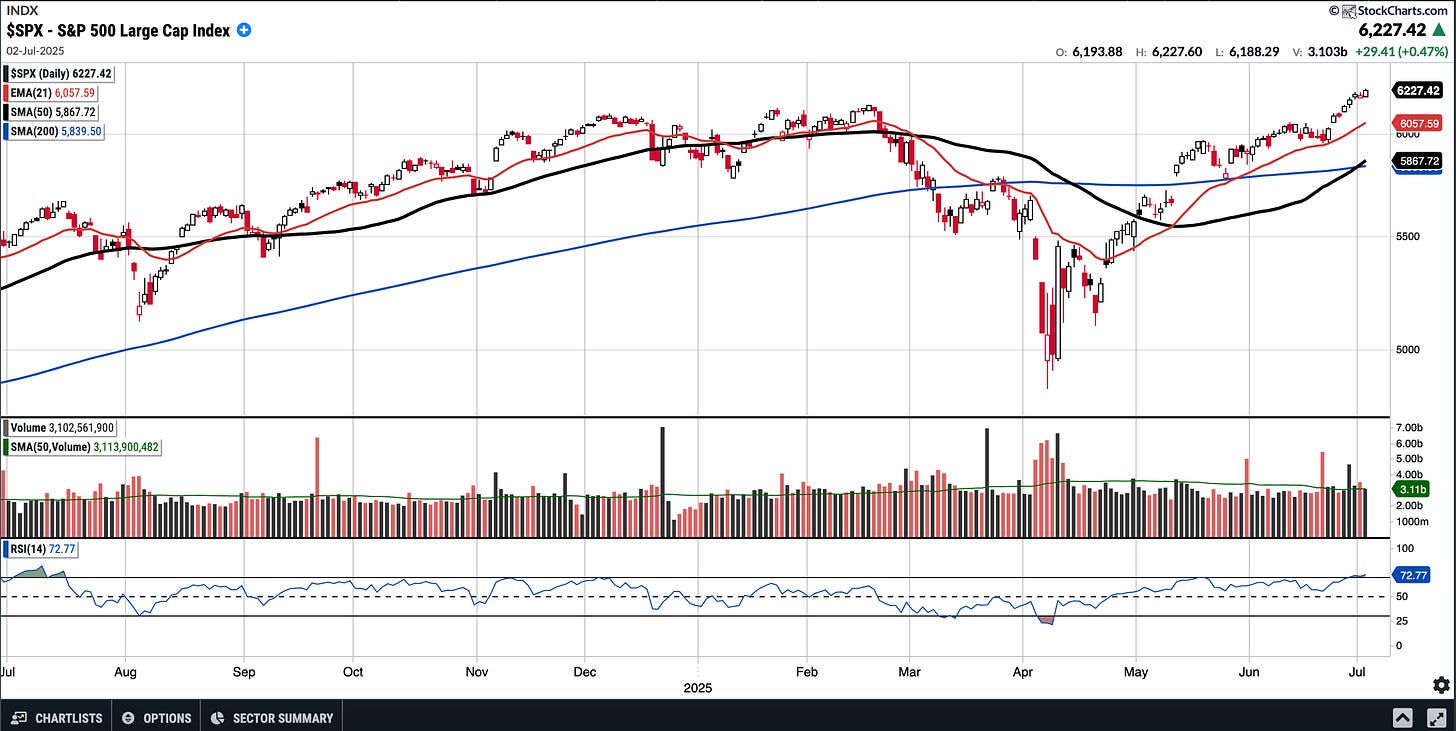 Sits currently at 6227.42, RSI 75.57. 6.65% above 50SMA.