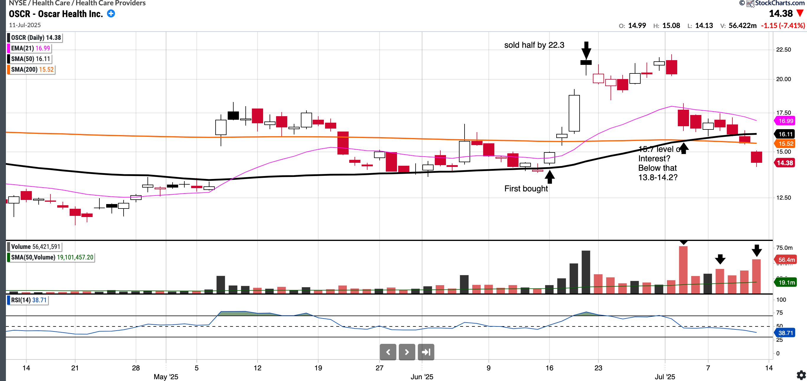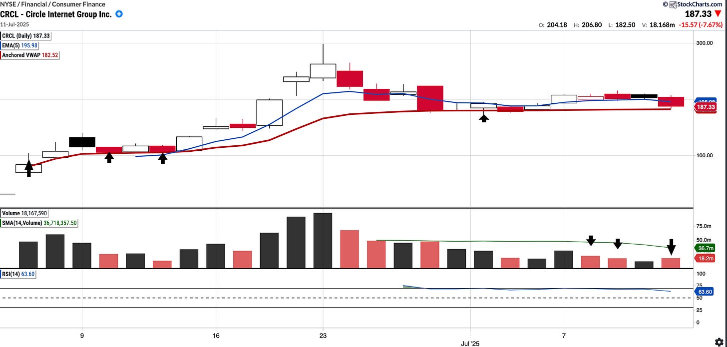 CRCL (plus other momentum names) sold off sharply on Friday albeit on low volume (see arrows). I am in with round 2 at average of 174, It will be interesting to see if can hold the AVWAP this week. If not may be time to cut.