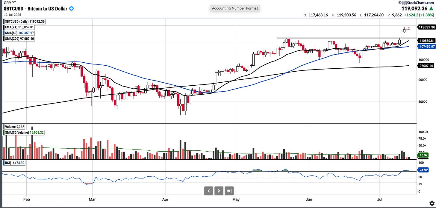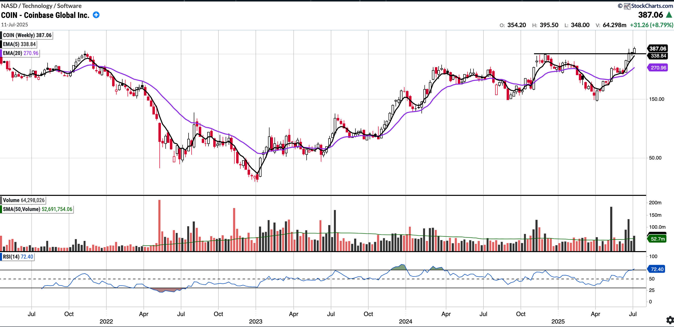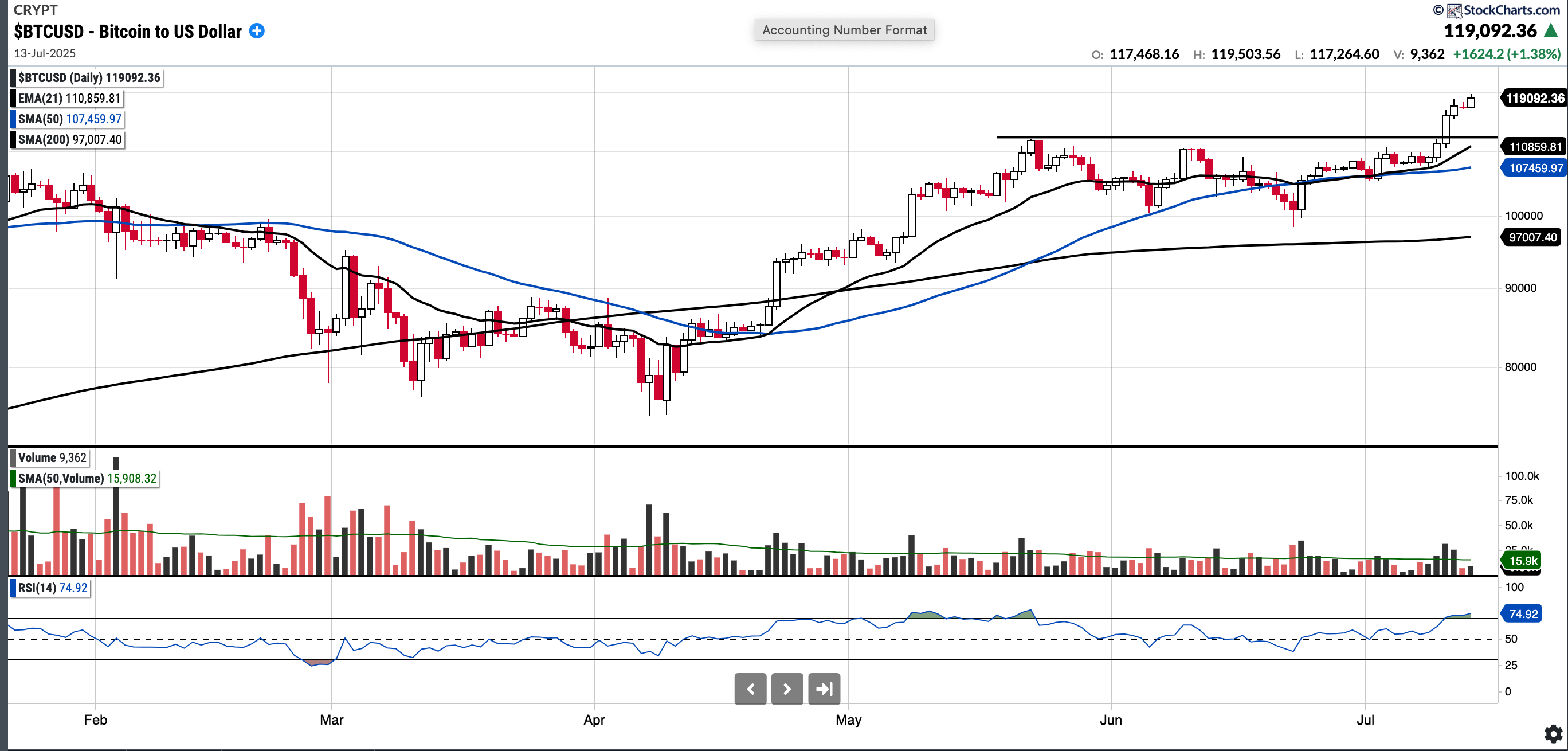 All Key MA’s up-trending and the chart had shown steady accumulation since April, during which time it did show RS also. So, it is no surprise we broke above prev ATH of 111,980 (as stated last weekend). A multi-week breakout would be a huge boon for crypto equities.