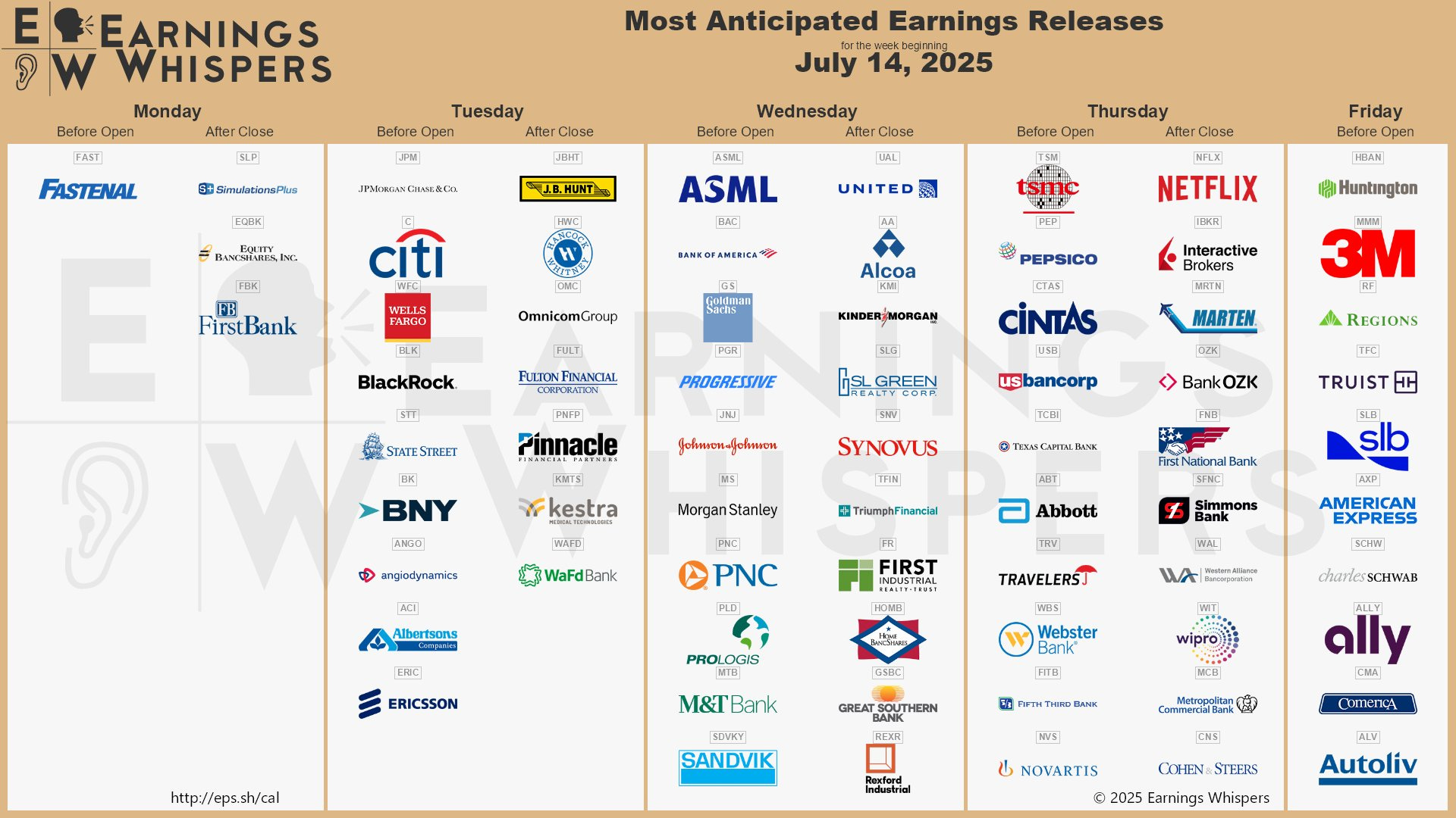 Earnings season kicks off in earnest. Below is infographic by Earnings Whispers for the upcoming week. Notable ones for me are: