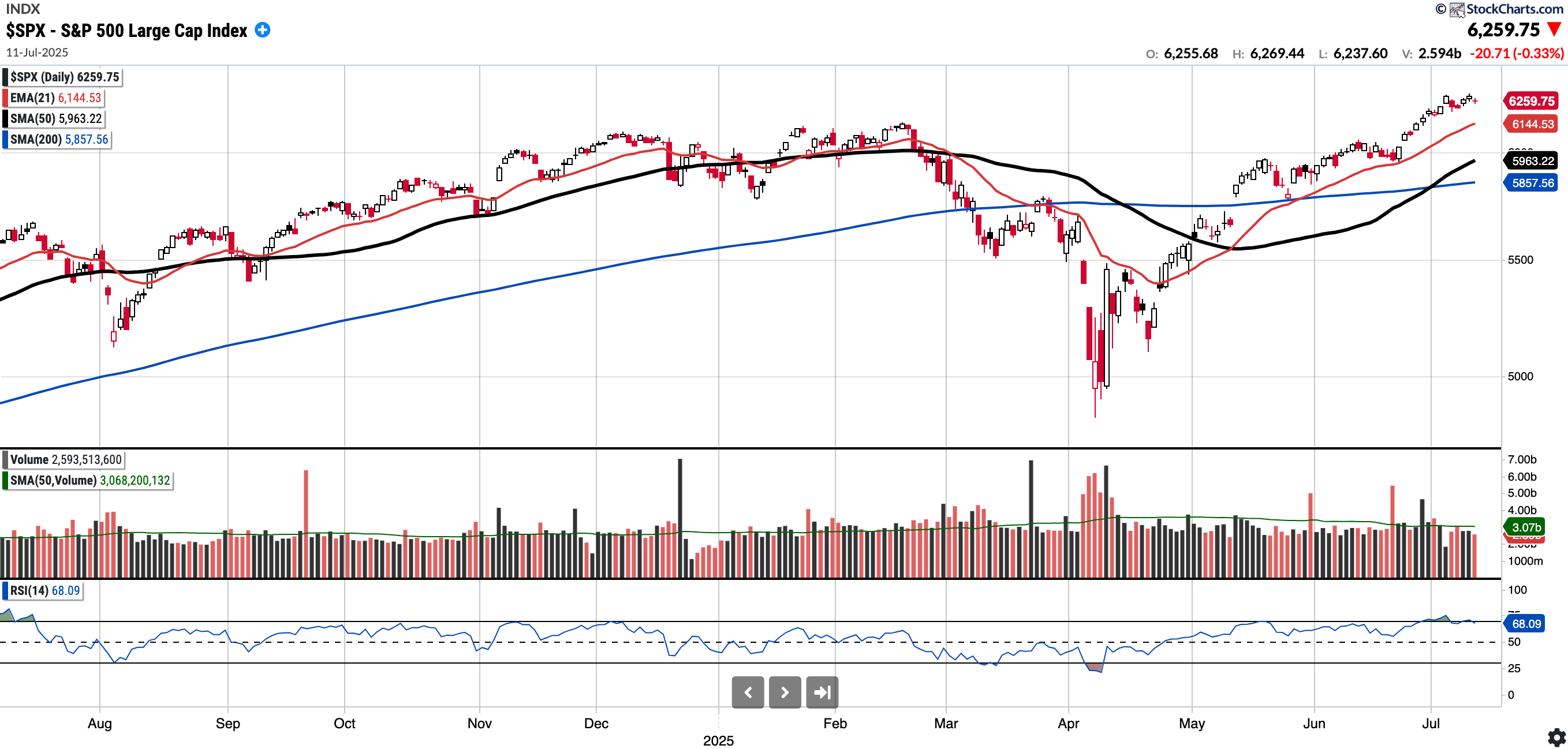 Sits currently at 6259.75, RSI 68.09. 4.97% above 50SMA.