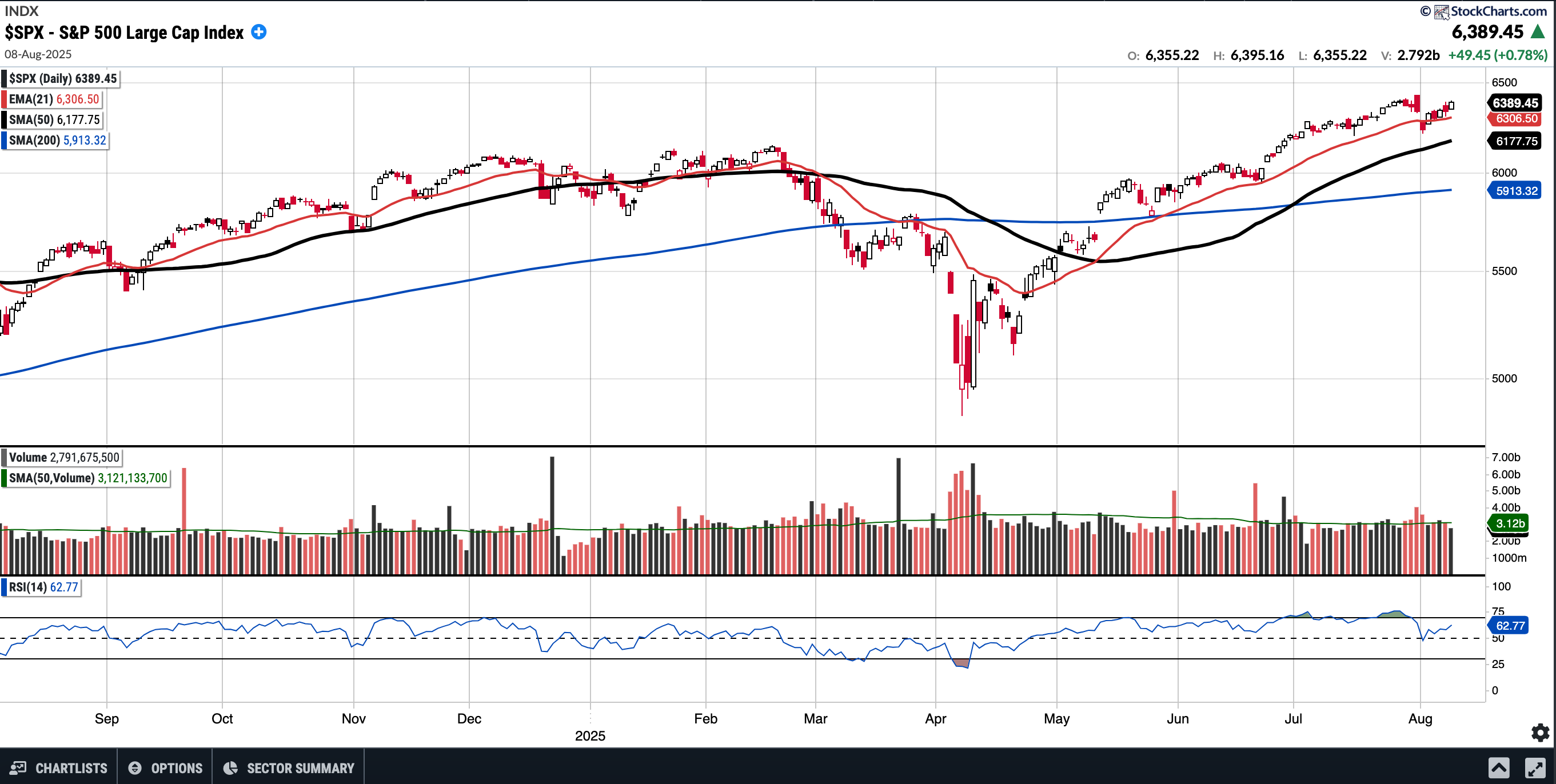 Sits currently at 6389.45, RSI 62.77. 3.43% above a rising 50SMA.