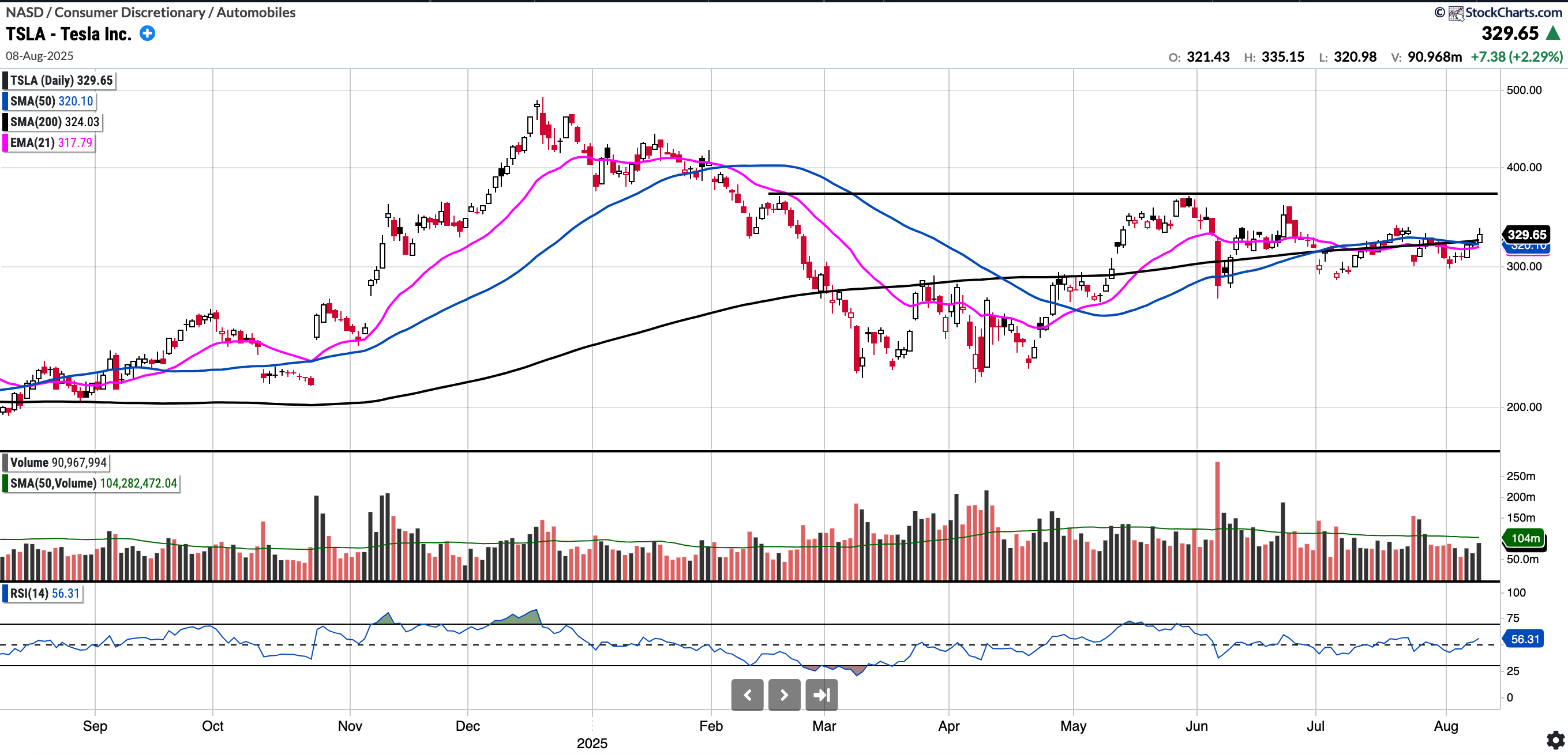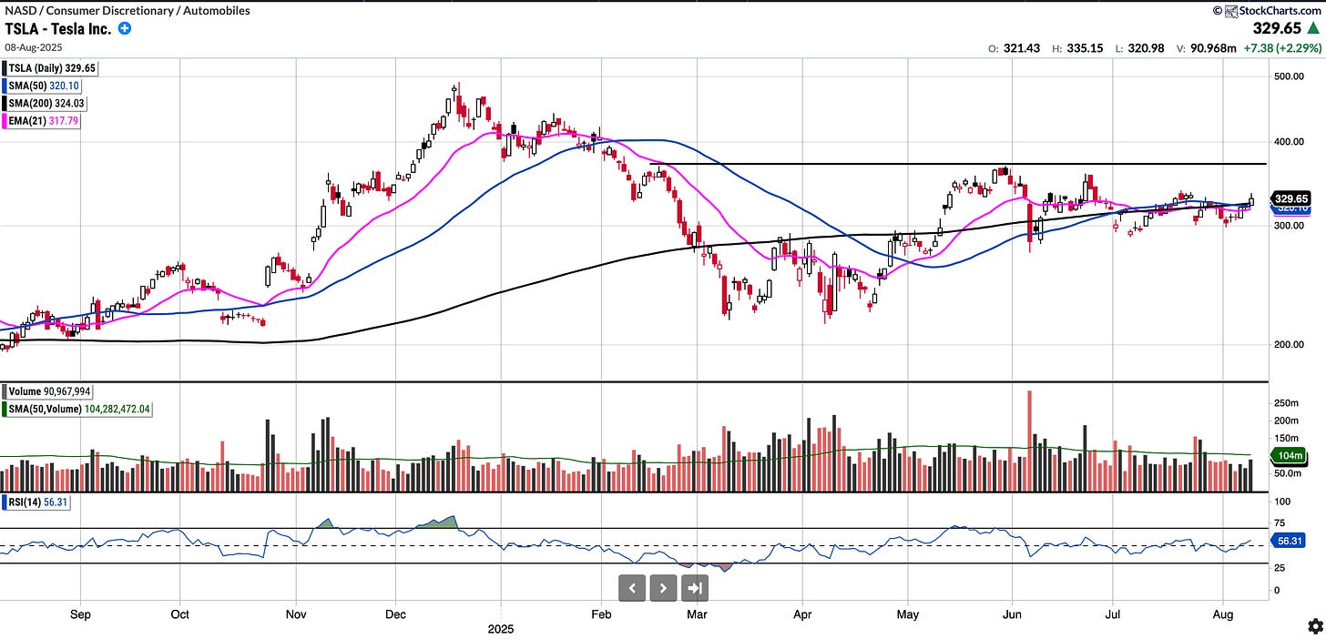 TSLA has reclaimed all its key moving averages and has shrugged off a lot of bad news in recent weeks, such as poor earnings reports, poor delivery numbers, the unimpressive launch of its Robotaxi, and, last but not least, Elon's kerfuffle with the sitting U.S. president. That is notable.