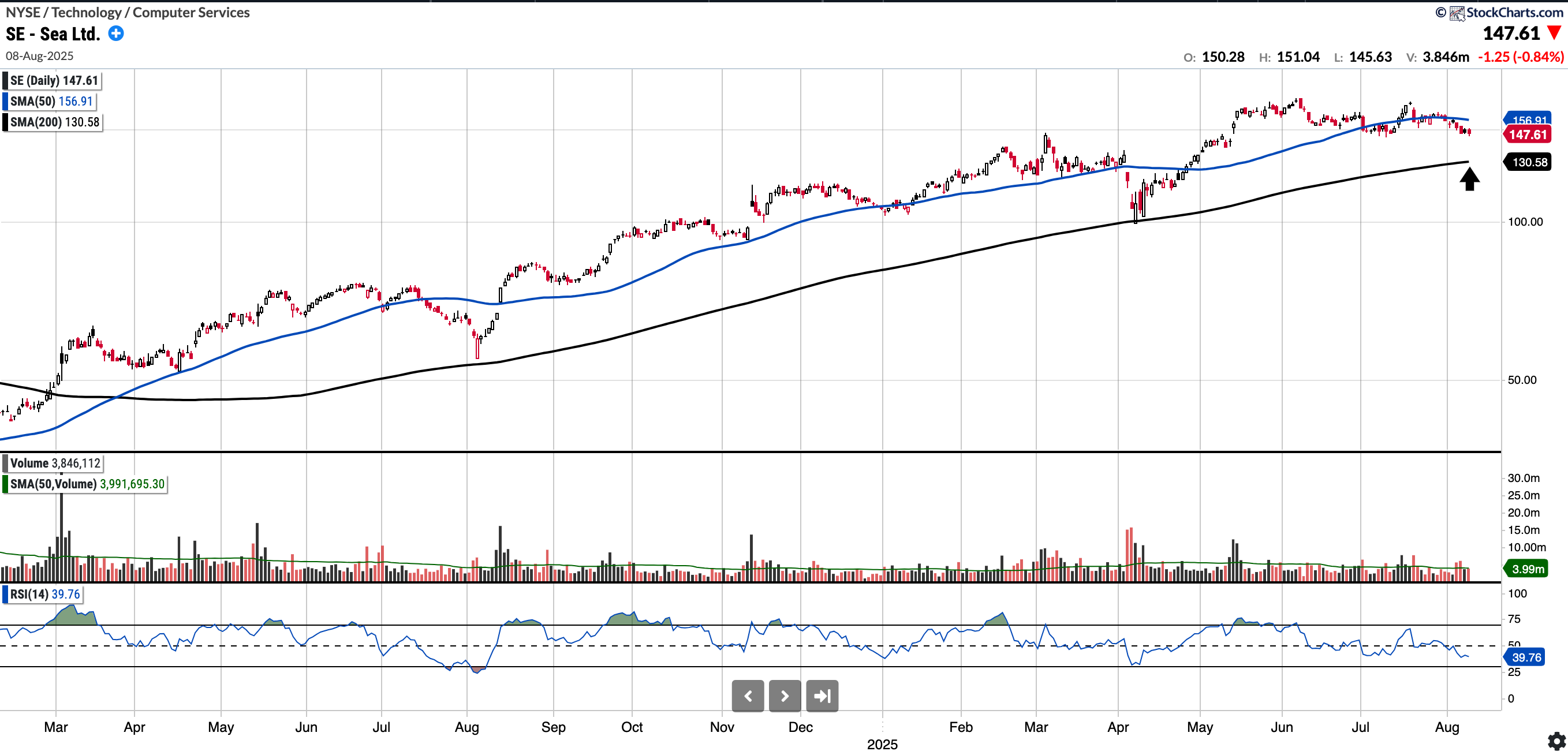 SE has lost the SMA 50 with several red days in recent weeks and is $20 off the highs. Earnings are pre-market on the 12th of August. This will be a high volatility event and so I would not be surprised to see the SMA 200 re-tested. It has been a strong support in the last 18 months, let’s see if it holds again. If not 100 might be in play!