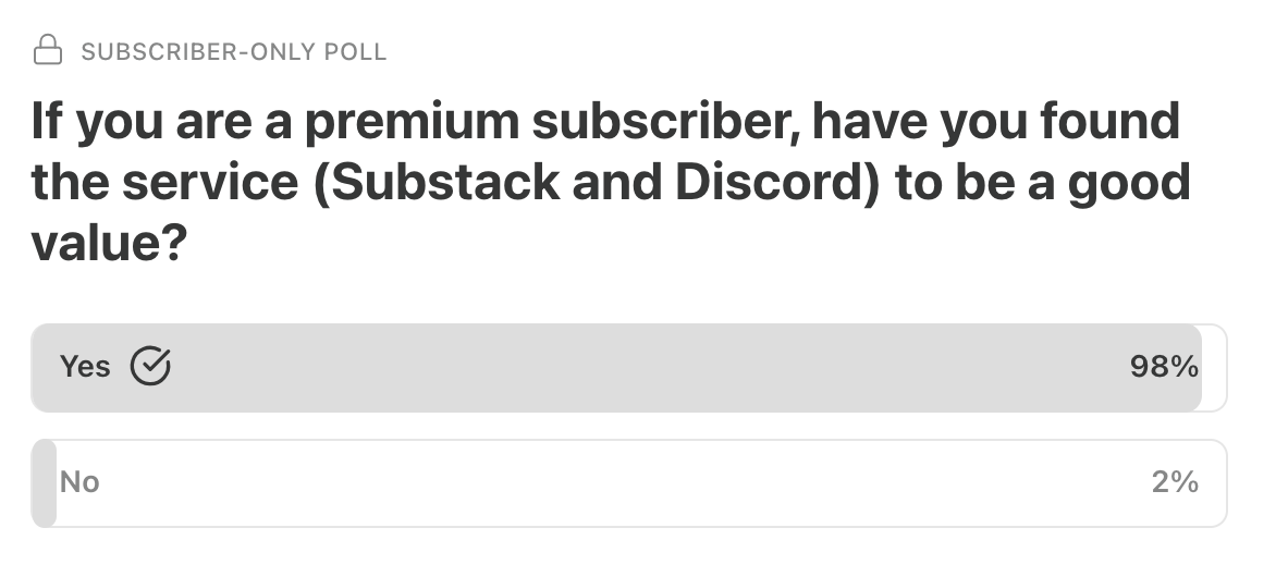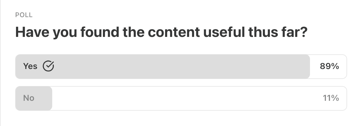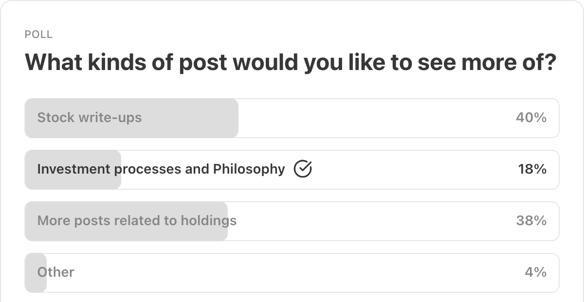 I am surprised that over 10% of respondents felt they did not learn or gain useful insights, especially considering the variety of content provided, such as stock write-ups, investment philosophy, and market memos. Nevertheless, I am committed to improving my output to ensure I consistently deliver high-quality posts for everyone.