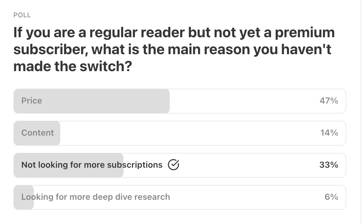 “If you are a regular reader but not yet a premium subscriber, what is the main reason you haven’t made the switch?” They answered: