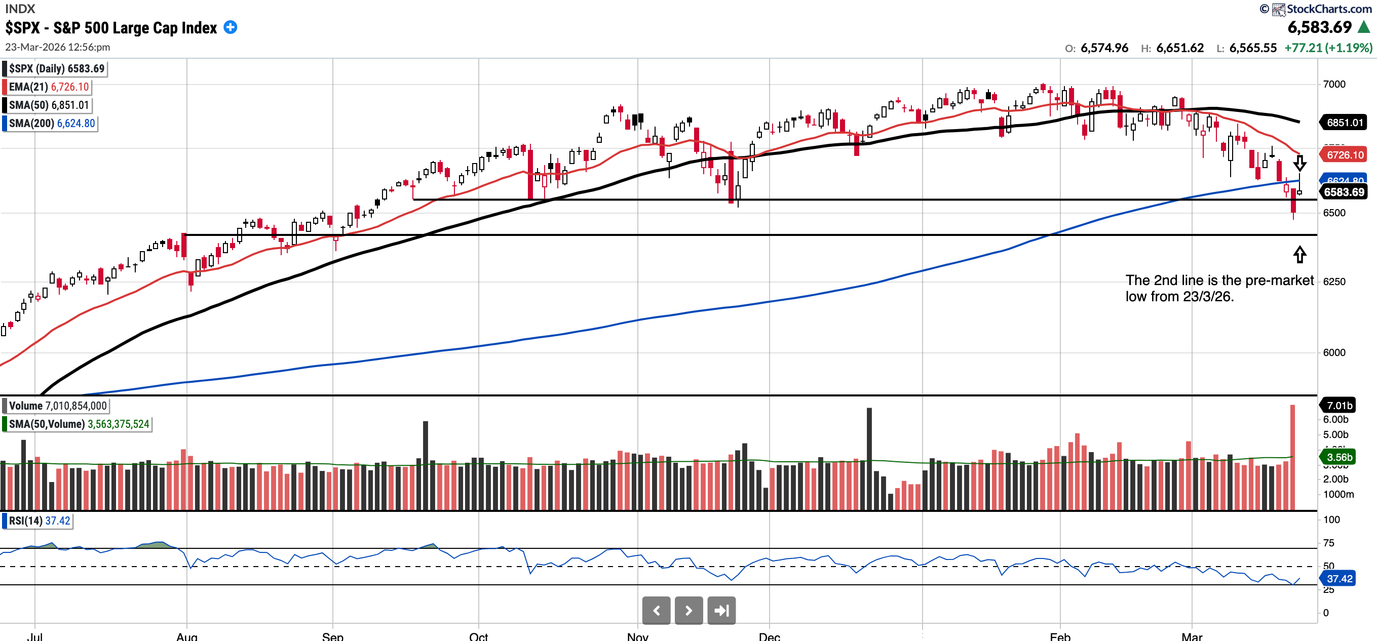The chart below adds a second trendline at the session's pre-market low. It and the 6520 level are key levels that must be held.