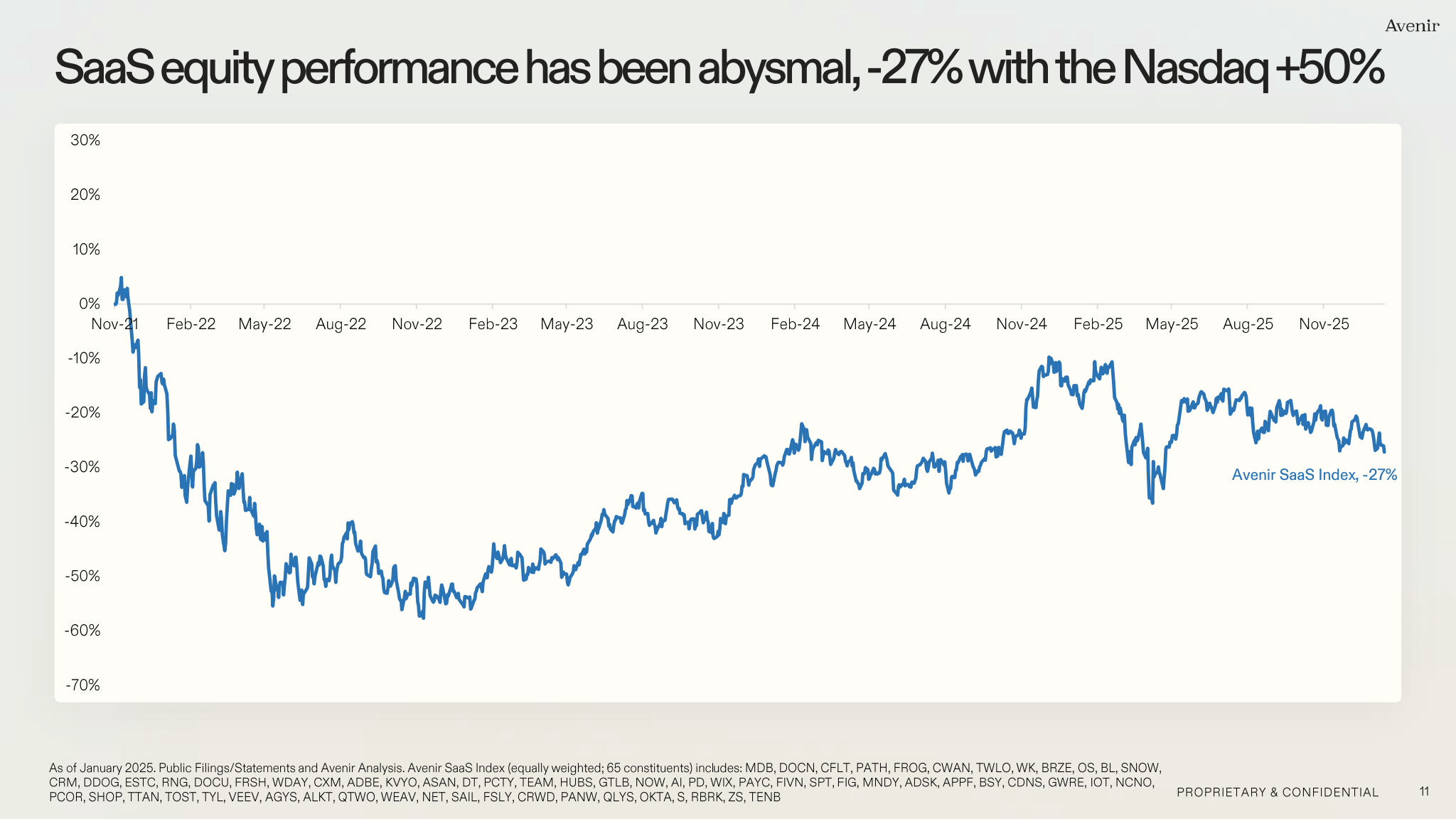 Software is down 20% from October. IGV has dropped 16% in January alone. ServiceNow, Salesforce, HubSpot, Atlassian - all hitting 52-week lows.