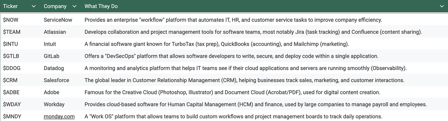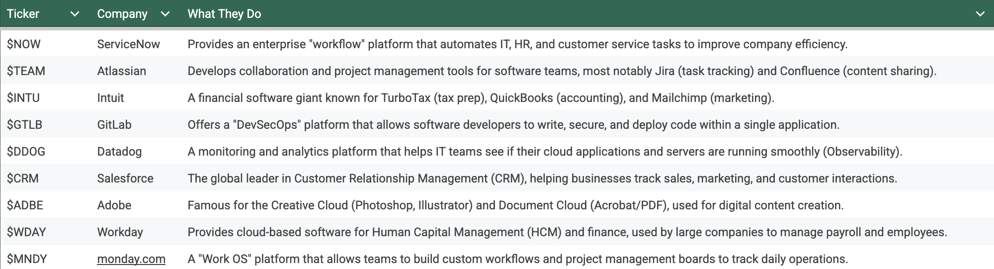 The table below includes names that I believe are worth watching. This is not a complete list, and there are many other high-quality companies such as SAP, NET, ZS, PLTR, MDB, SNOW, and TWLO that may be considered.