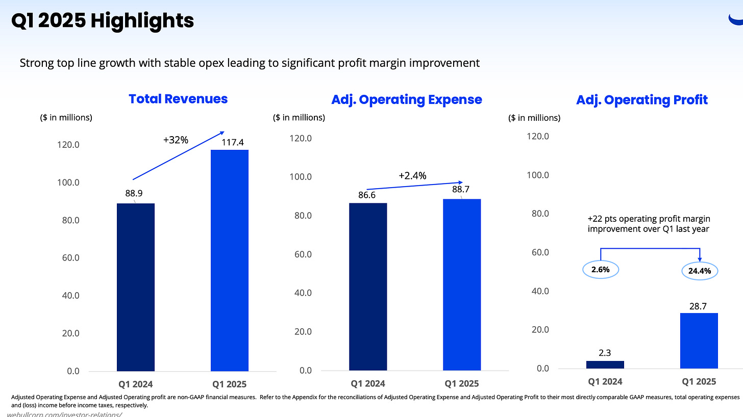 Total revenues grew 32% YOY to $117M, reflecting strong account and trading volume growth Customer assets increased 45% year-over-year, driven by increased customer net deposits Disciplined execution alongside robust revenue growth driving profitability. Evidence of this is the fact total operating expenses decreased 2% YOY meanwhile revenues expanded by 32%.