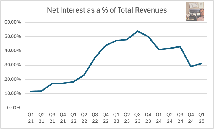 Net Interest Revenue accounted for 62M out of total 522M Revenues in Q1 2021 and accounted for 290M out of a total 927M in Q1 2025.. As a % of Total Revenues it has therefore, increased from 11.88% in Q1 2021 to 31.28% in Q1 2025. It actually peaked as high as 53.75% in Q3 2023!