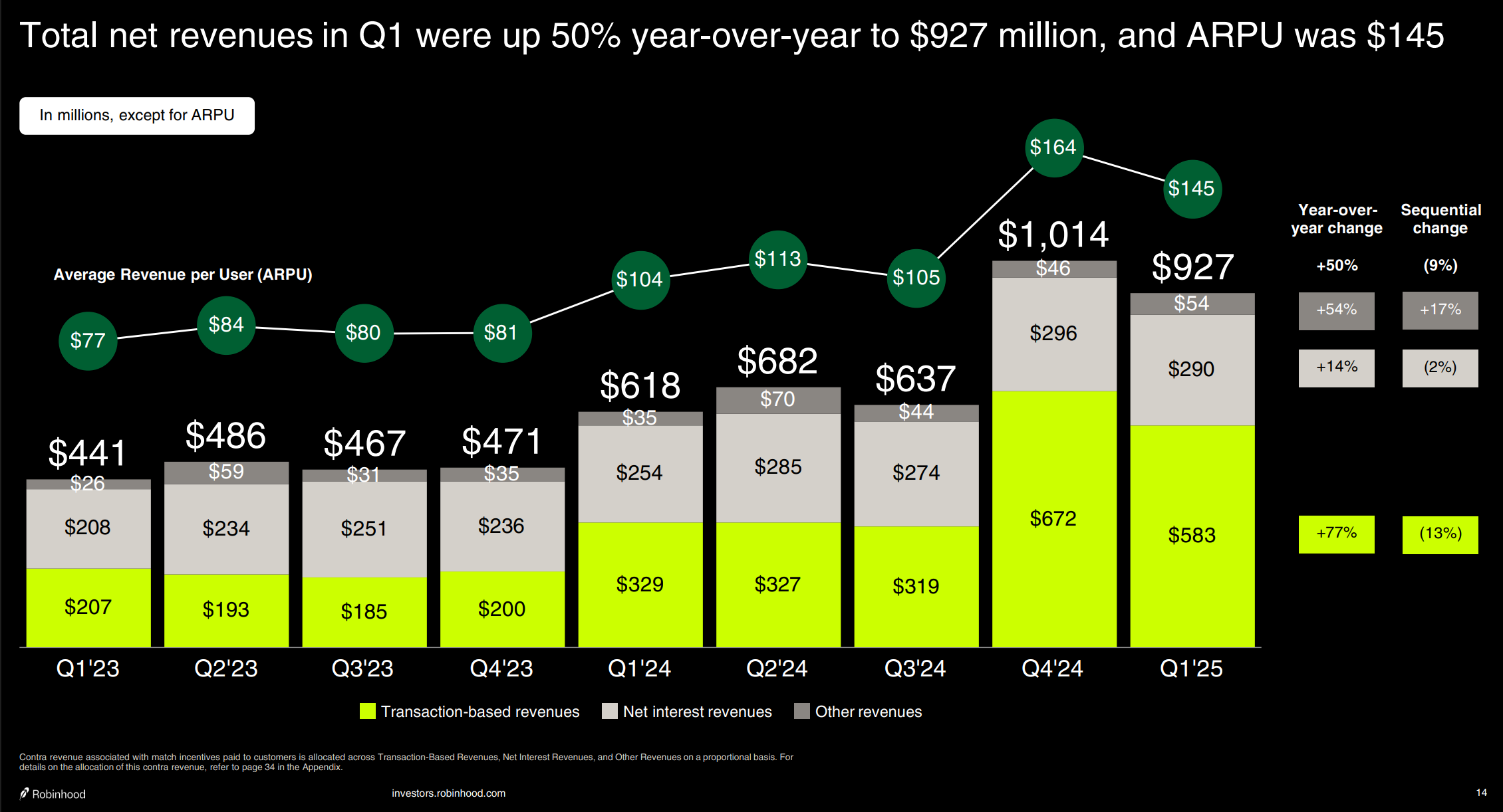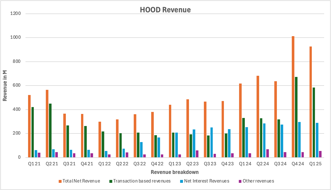 Since Q1 23, total revenues have increased from 441M to 927M in Q1 25. Net Interest Revenues have increased from 208M to 290M over those quarters. Meanwhile, Transaction based revenues have gone from 207M to 583M in Q1 25 and actually were as high as 672M in Q4 24!