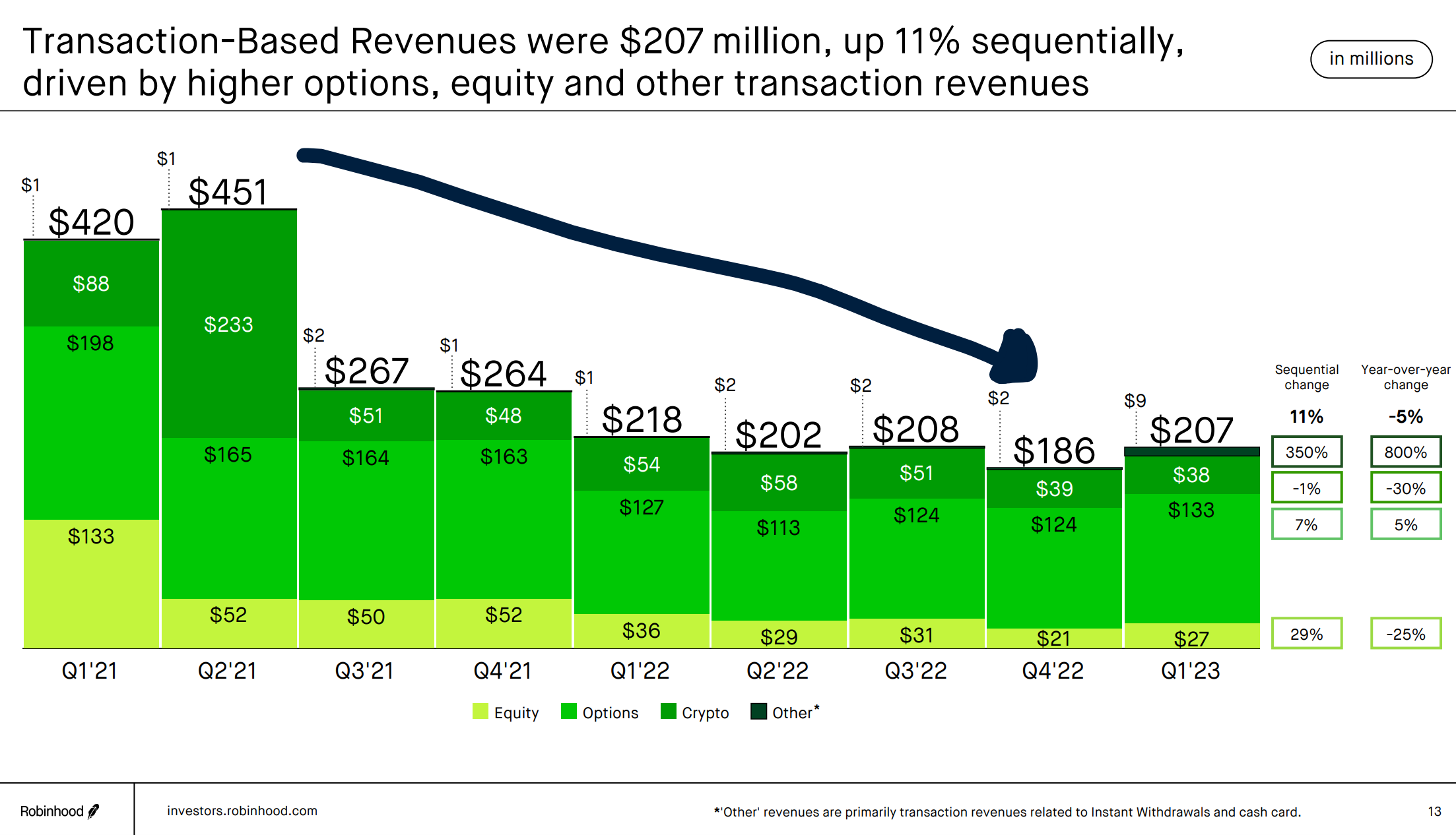 The below chart shows how Transaction-based revenues fell in 5 out of 6 quarters between Q2-21 and Q4 22. Revenue from Options also fell in 5 consecutive quarters. Crypto based revenues peaked at 233M in Q2 21 and fell all the way down to 39M in Q4 22 which was the depths of the Equity and Crypto Bear Market.